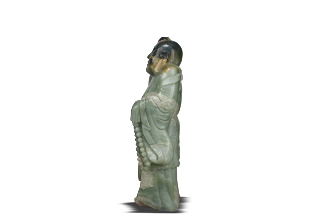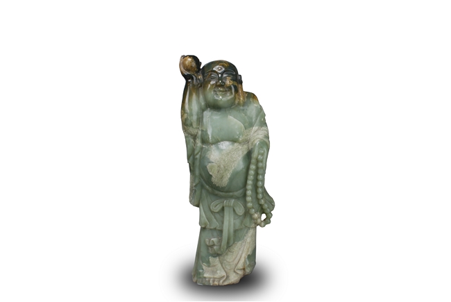 Standing upright, the figure depicts Budai monk holding a ball in his right hand, slightly above his head, while left hand holding a long strand of prayer's bead. He is depicted with a hearty smile.