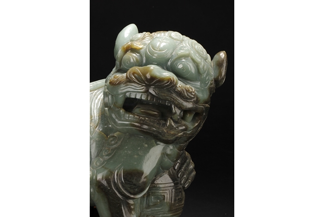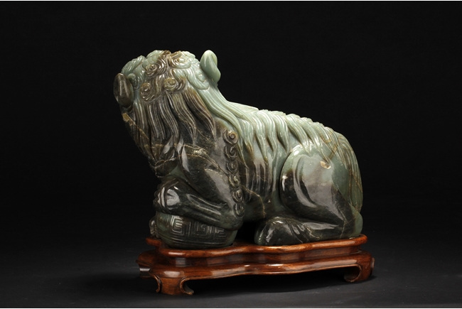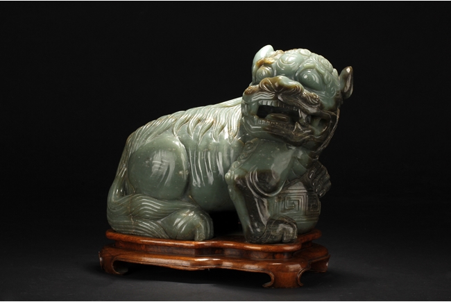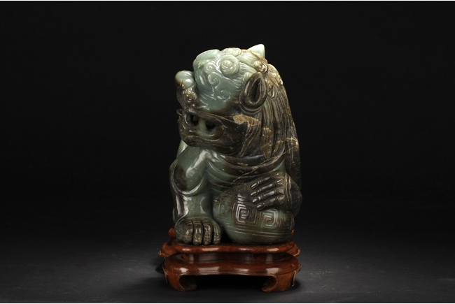 The jade mythical beast seated on hind legs, with one front paw touching ground, and the other on top of a round ball with key-fret patterns, the beast's head turned side ways, tail hanging sideways. Completed with original stand.