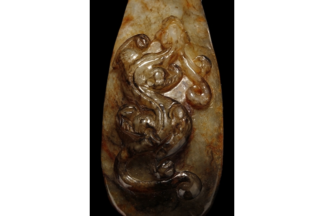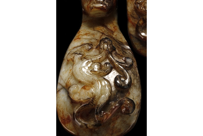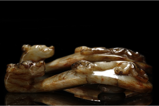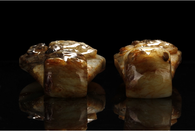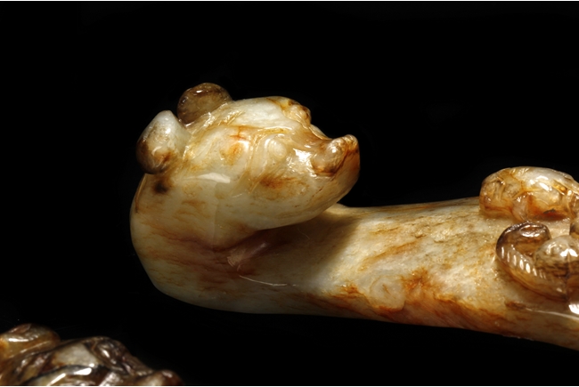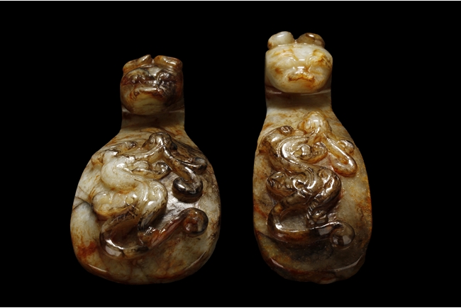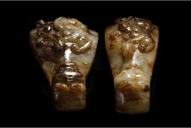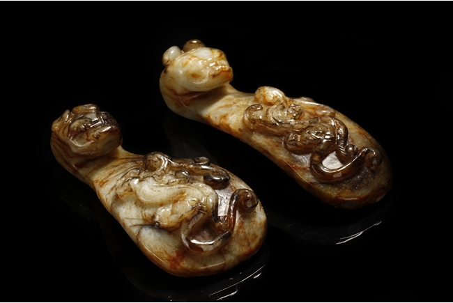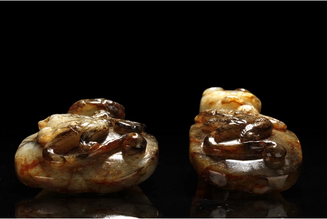 The two belt hooks both depicts larger dragon confronting the smaller Chilong, with a knob on reverse. The stones of white color and with russet at different locations.