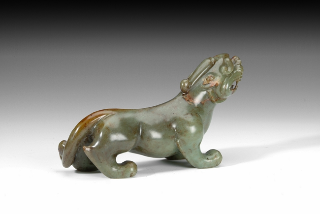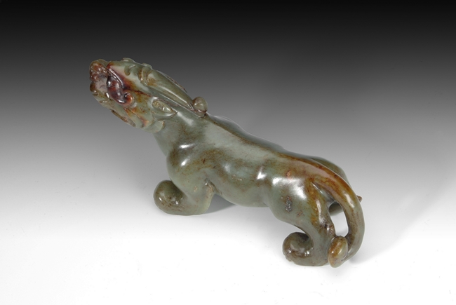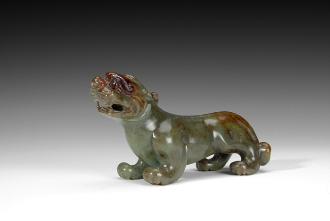 This figure is carved in the form of a mythical beast. It has ferocious posture and snarling teeth. Republic period.