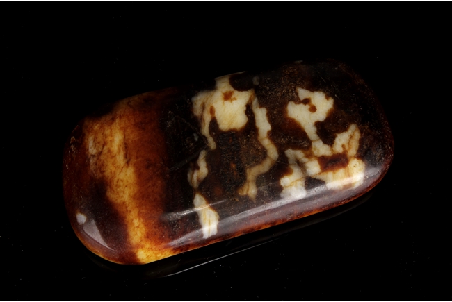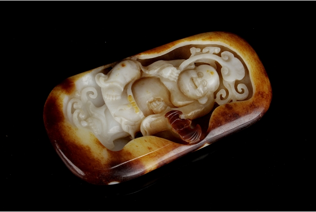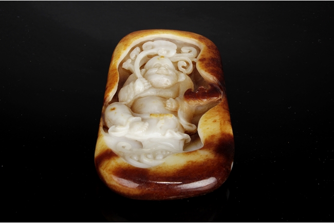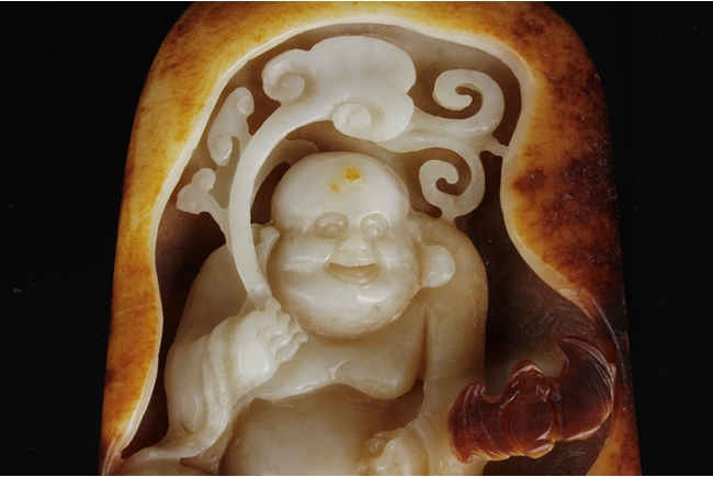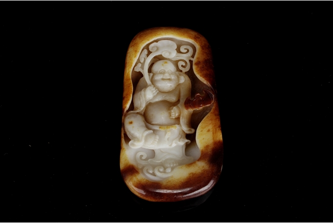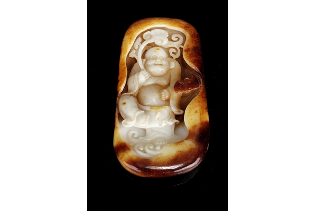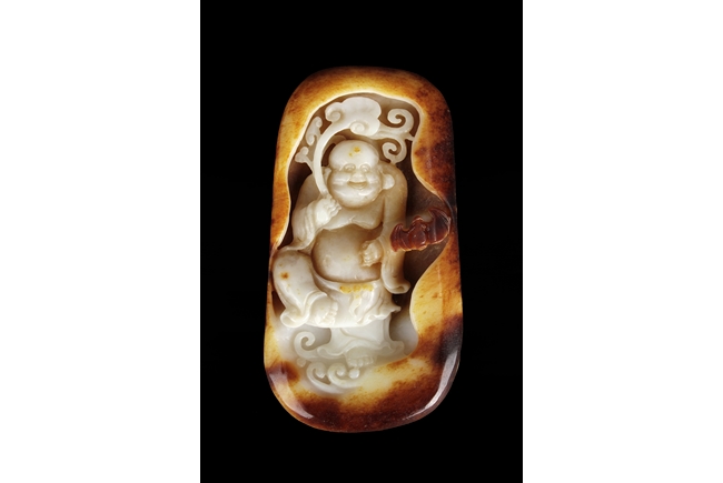 Of oval form, the jade high relief carved with an Arhat holding a branch of Lingzhi, flying among clouds, with a bat nearby. The carving cleverly utilized the russet on the stone.