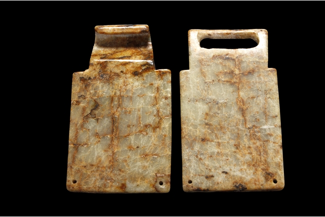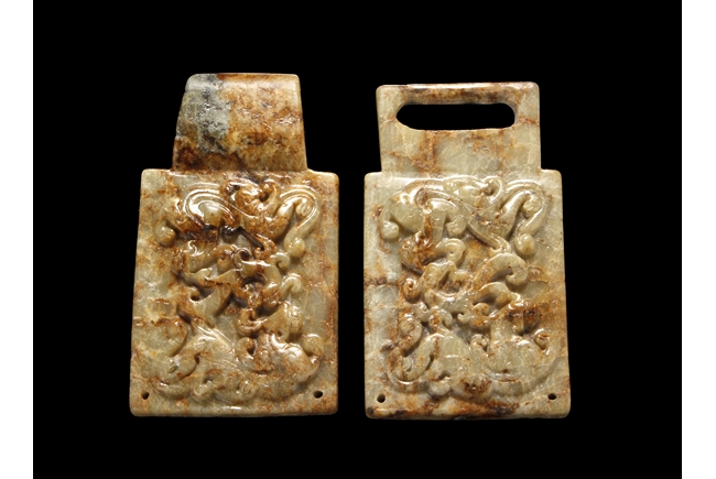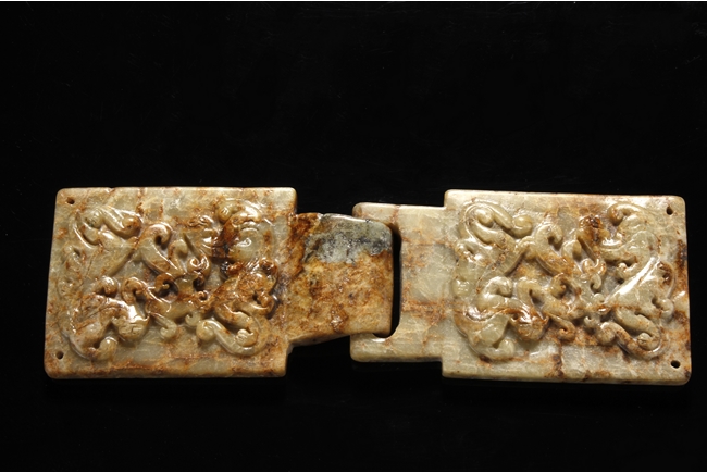 The jade stone of celadon color with russet, surface carved with multiple Chilong, end of buckle each with two small holes.