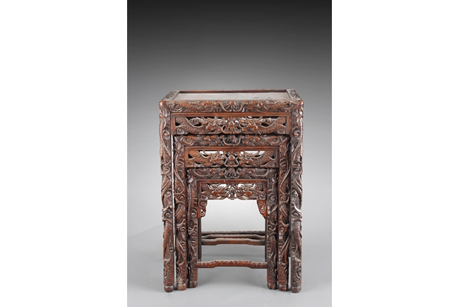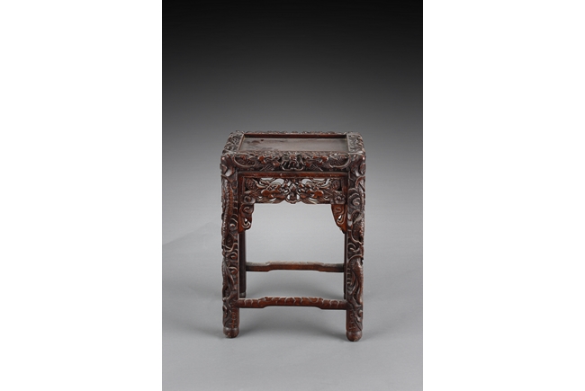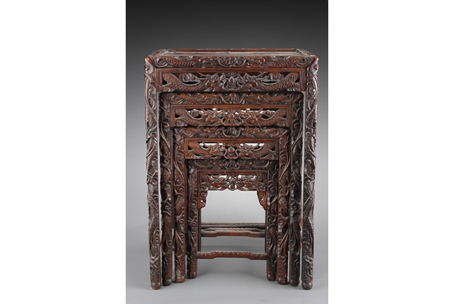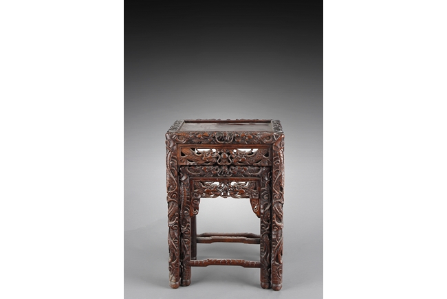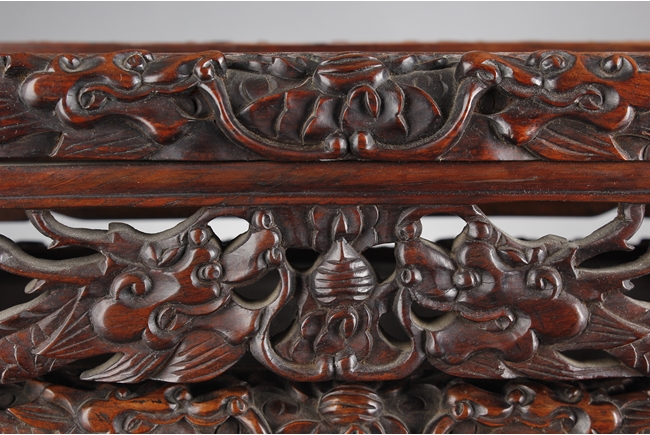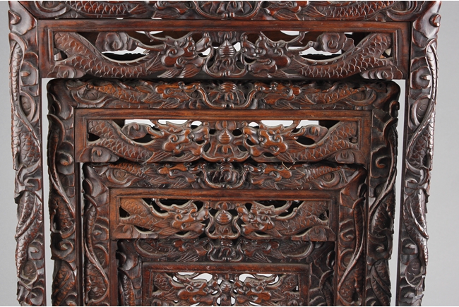 The set includes four different sized rectangular flower stands, able to stack neatly on top of each other from small to large. The legs and sides carved intricately with flying dragons, the skirt pierce carved with two dragons chasing flaming pearl, and top remain uncarved.