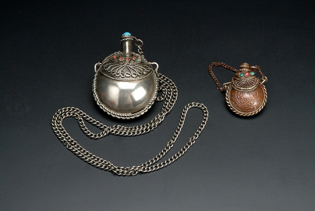 Delicately carved silver snuff bottles, both with a few turquoise and coral, and silver chains.