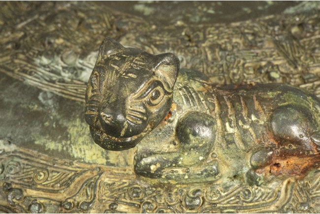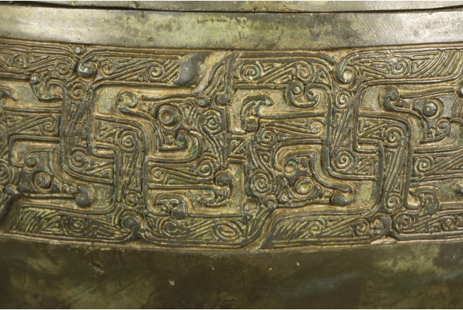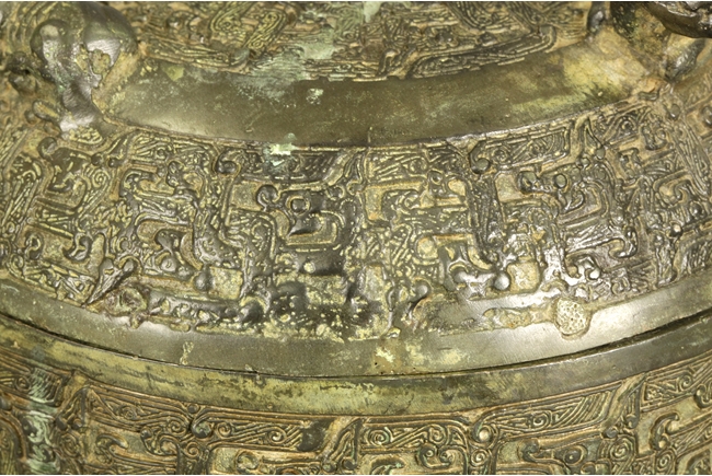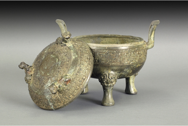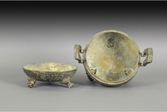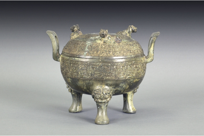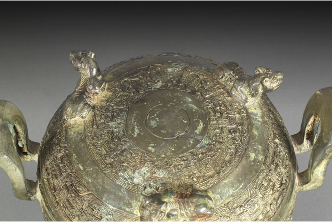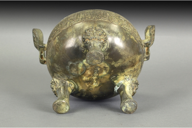 The deep, globular body is raised on three cabriole legs and has two upright handles decorated with intricate carvings. The surface has a milky green patina with extensive carvings, together with a cover, which has three mythical creatures residing on each side.