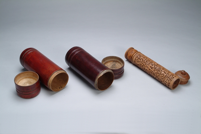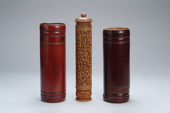 Two bamboo document scroll cases and one wood carved dragon pattern document scroll case.