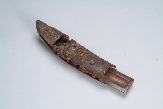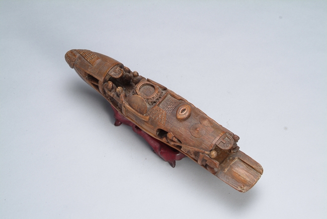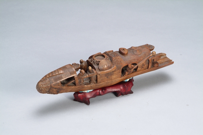 Two intricately pierce carved fishermen'sboats, carved from bmboo, one boat with stand.