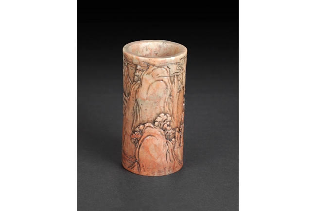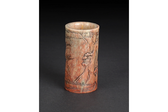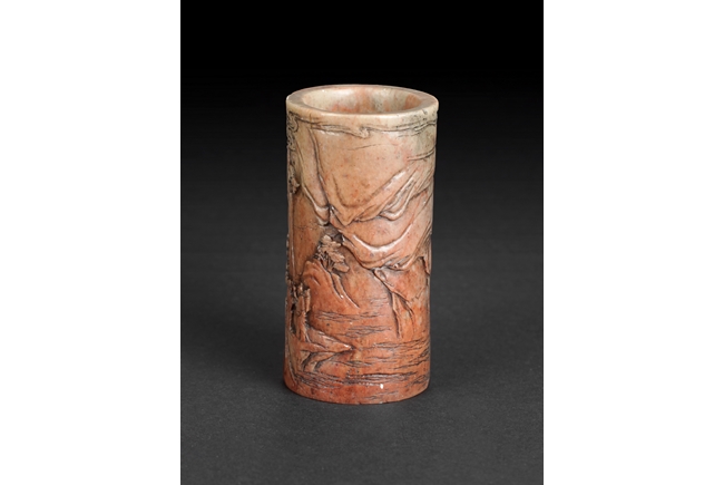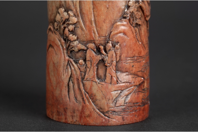 Of cylindrical shape, the brush pot carved with two elders and a young boy meeting in mountain setting, with rivers, trees, and pavillions nearby.