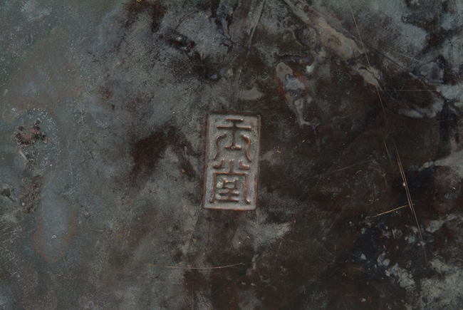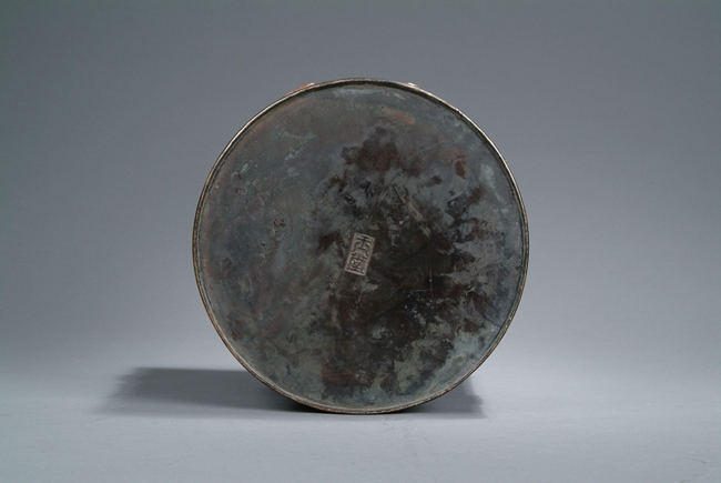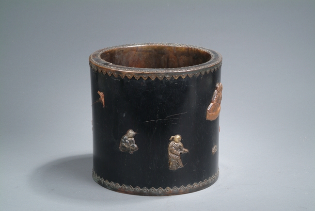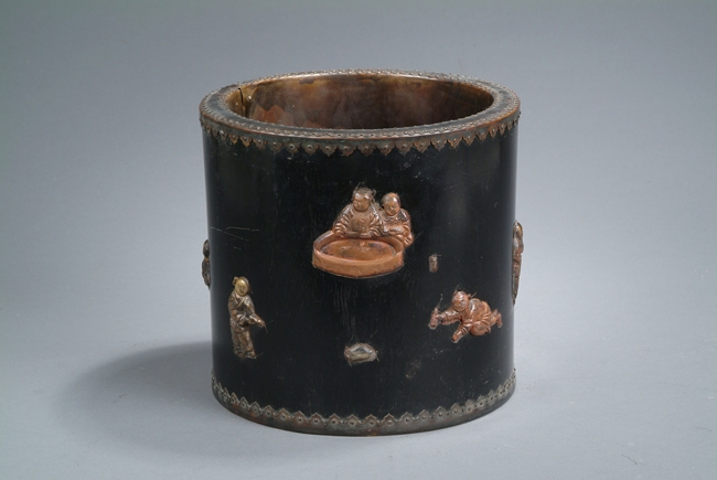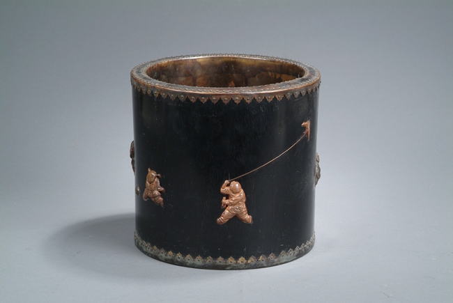 Of slightly tapering cylindrical form, the brushpot's top and bottom rims are sealed with dotted bronze enclosure, stone embellishments depicting playful children on the side, and bottom bears two characters mark.