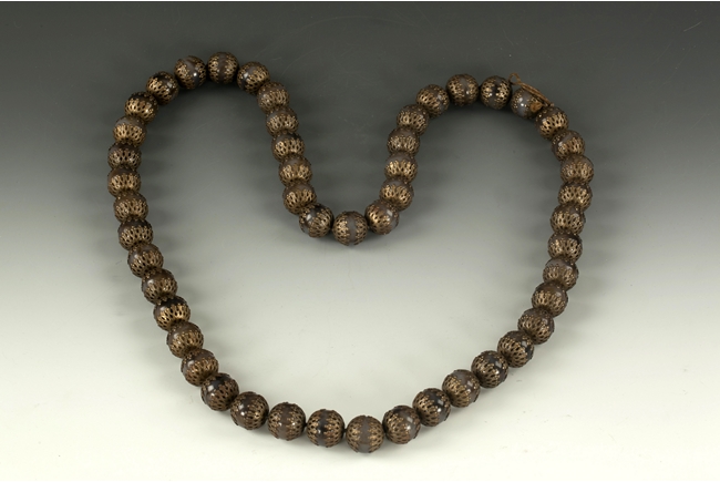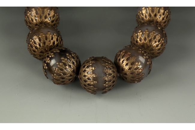 The strand of fifty agate beads are covered with silver decorations around each bead.