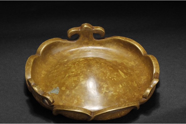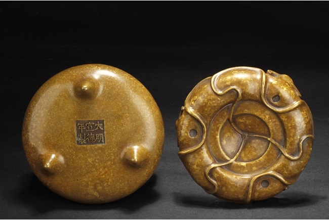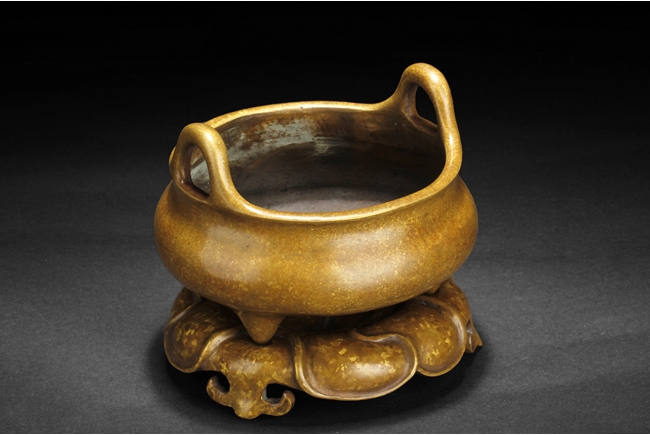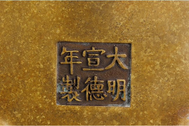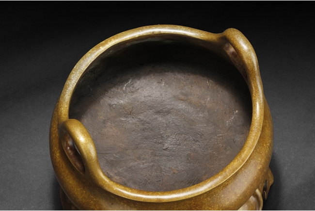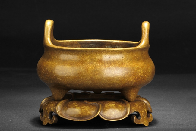 Of globular form, the tripod censer's three short legs stand on a lotus leaf shaped stand, two uprising handles attached to the lip. Bottom bears six characters "XUAND" mark.