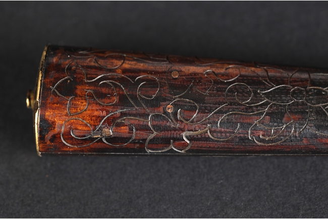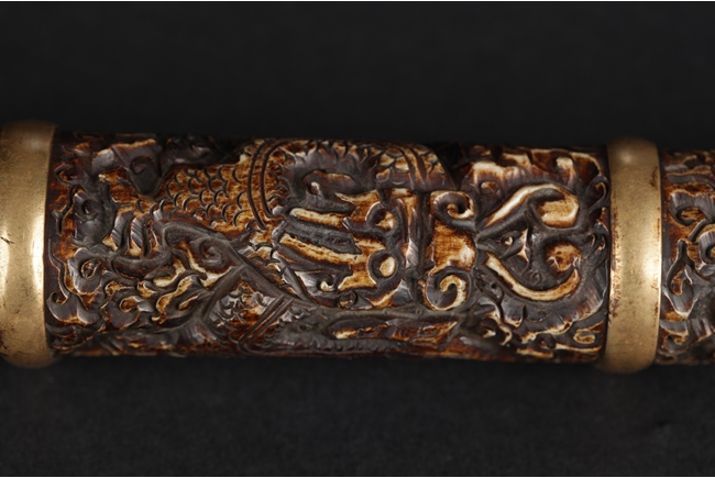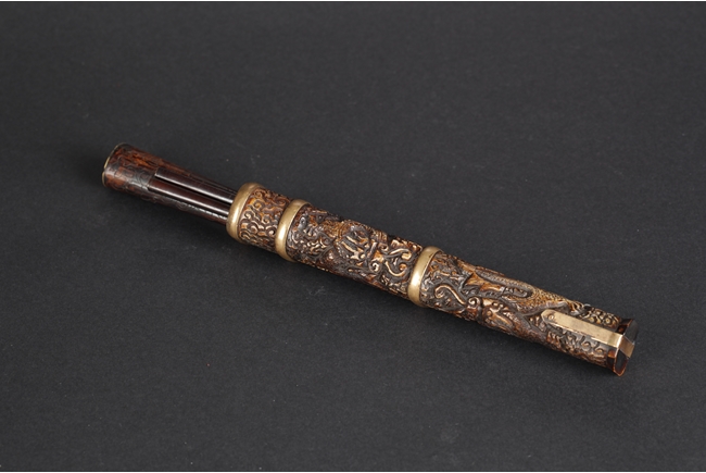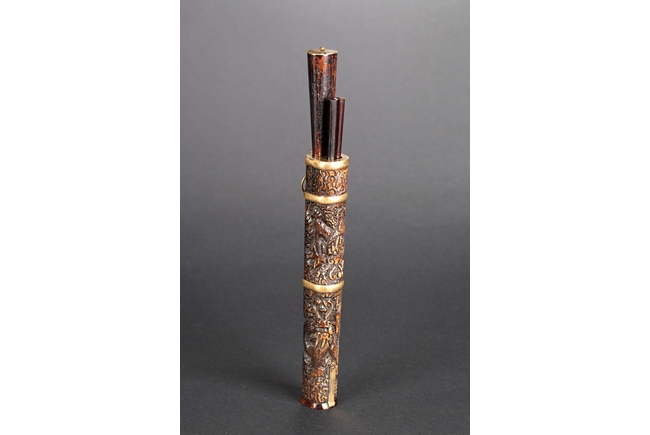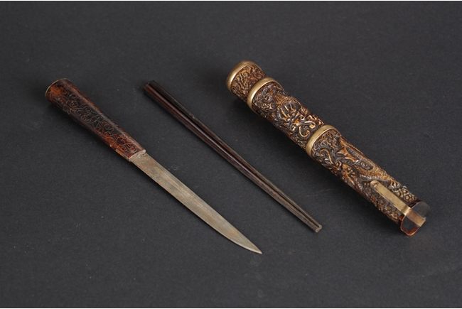 The unusual set includes a carved knife and a pair of chopsticks fitted perfectly into a carved sheath, depicting flowers on the knife handle and dragon on the sheath.