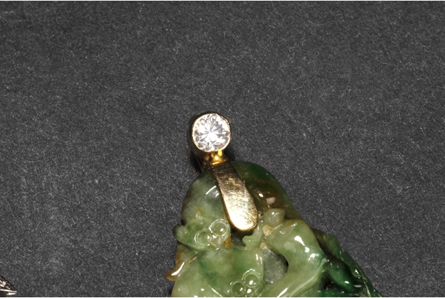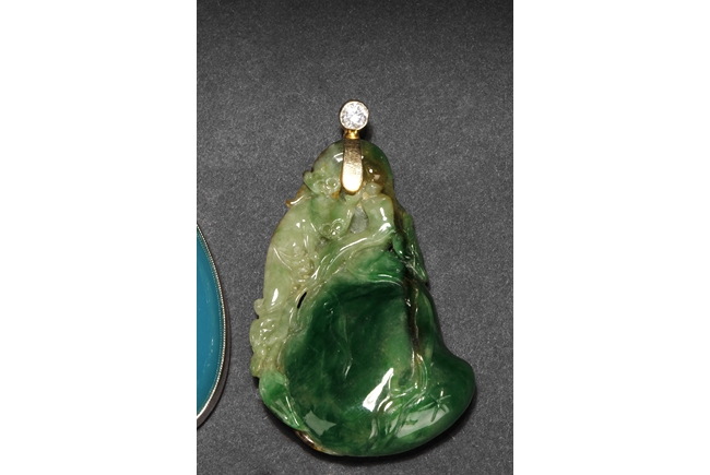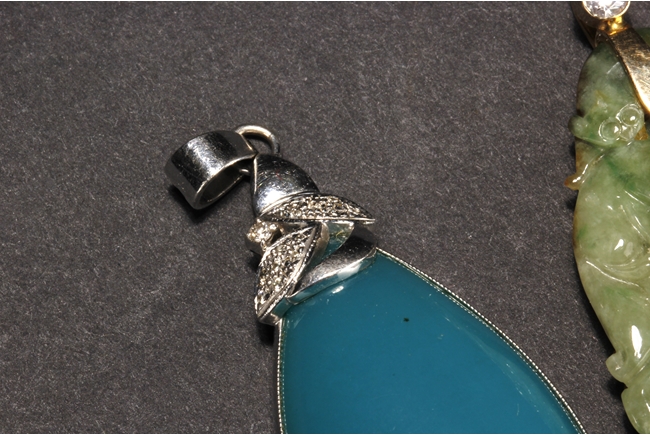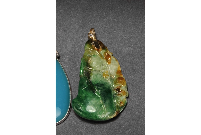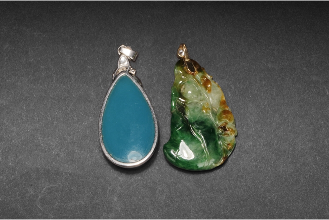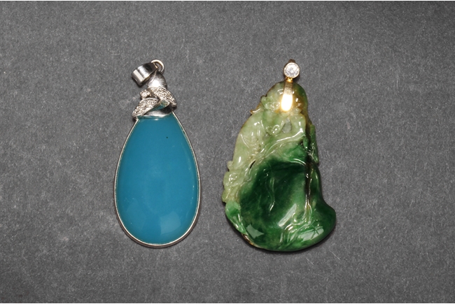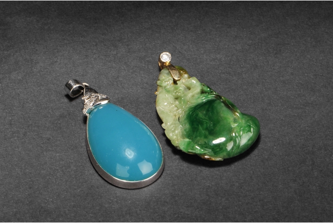 The jadeite pendant cleverly carved utilizing its green patches and russet, depicting lotus leaves, bat, Ruyi, and mythical beasts. The blue chalcedony pendant is of teardrop shape, in light blue color. Both gems are natural, and come with certificates.