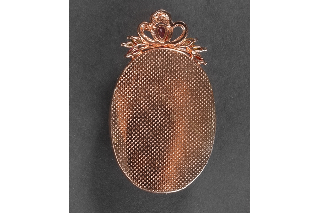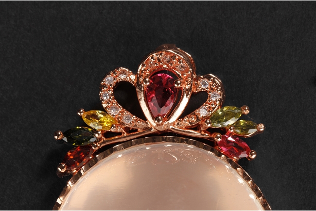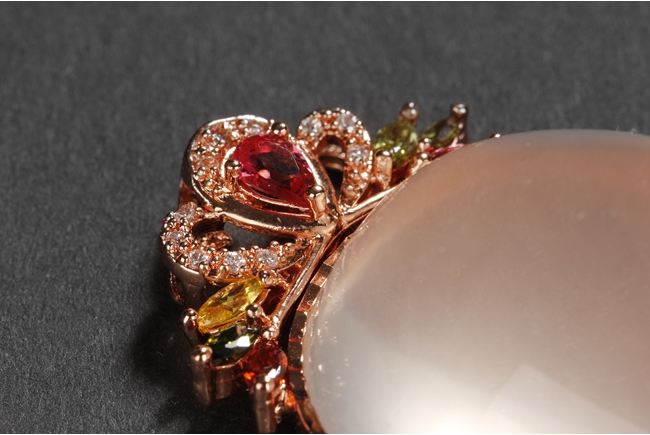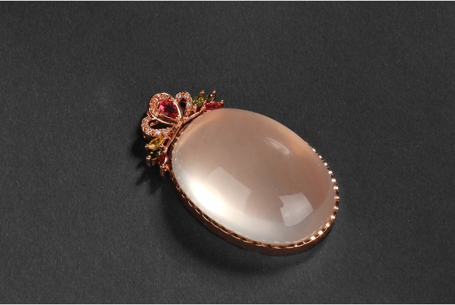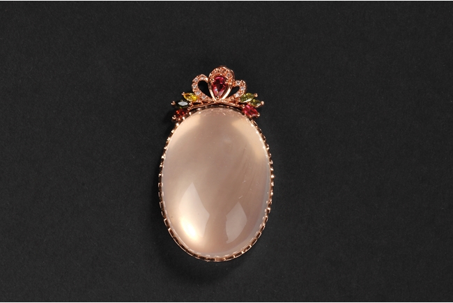 Of half ovoid shape, the rose quartz fitted within a frame with small colored gems and diamonds.