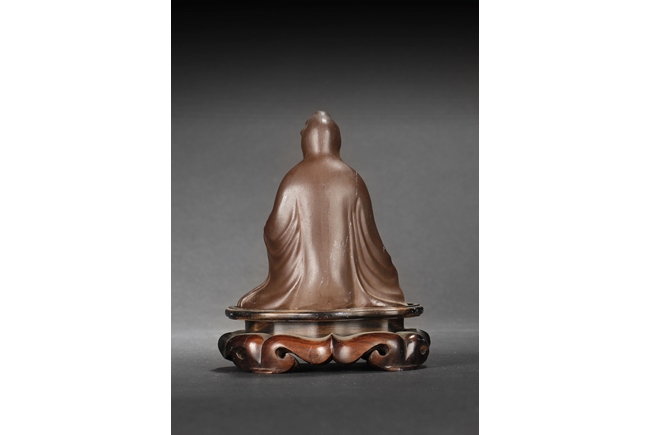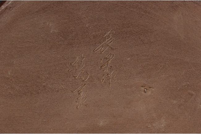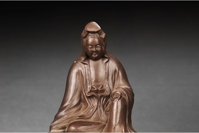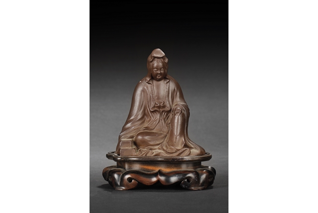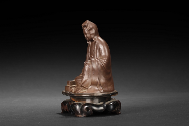 Wearing loose robe and veil, the Guanyin is seated with one leg supporting left hand, holding strand of prayer beads, stacks of books on the right side, all on top of a wood carved stand. Bottom with artist signature.