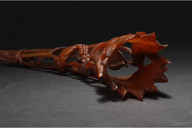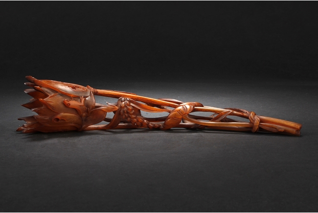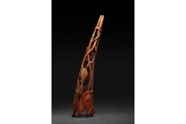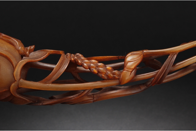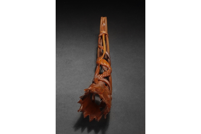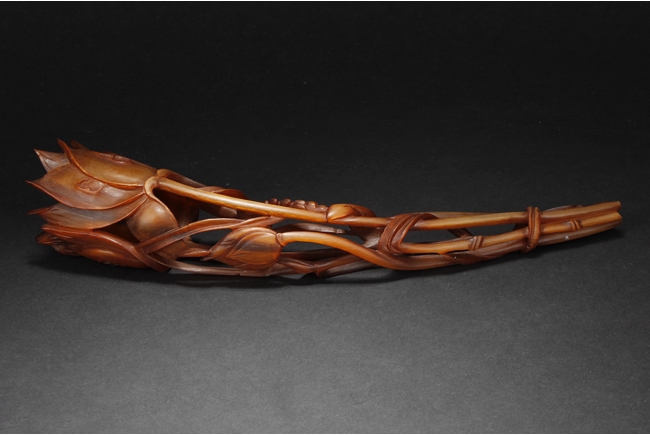 Intricately pierce carved, the figure depicts lotus flower, leaves, and bulbs, while retaining the natural horn shape and color.