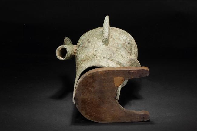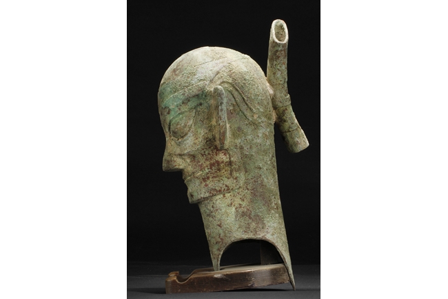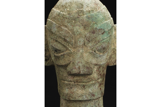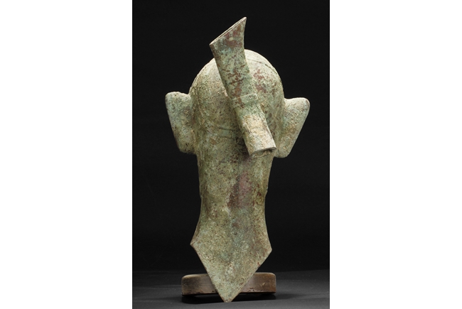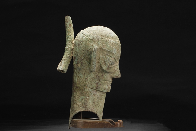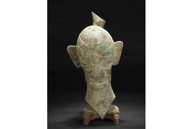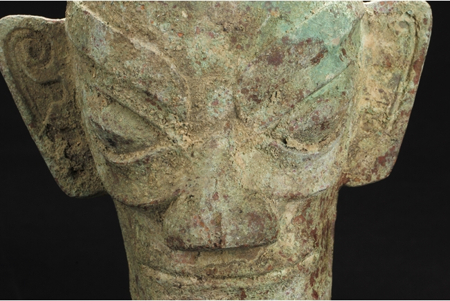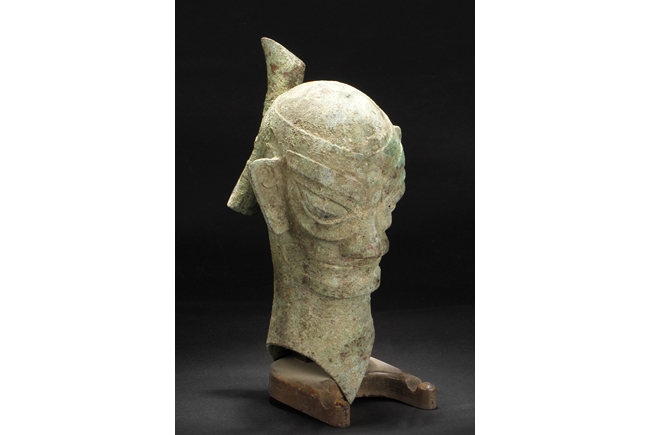 The head statue depicts a man with large ears, helmet over his eyes, and hair ornament on the back. Age related rust and oxidation.