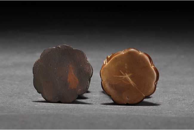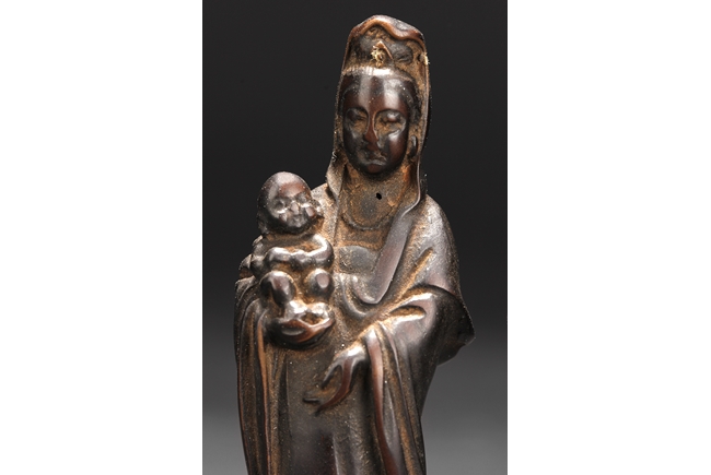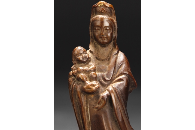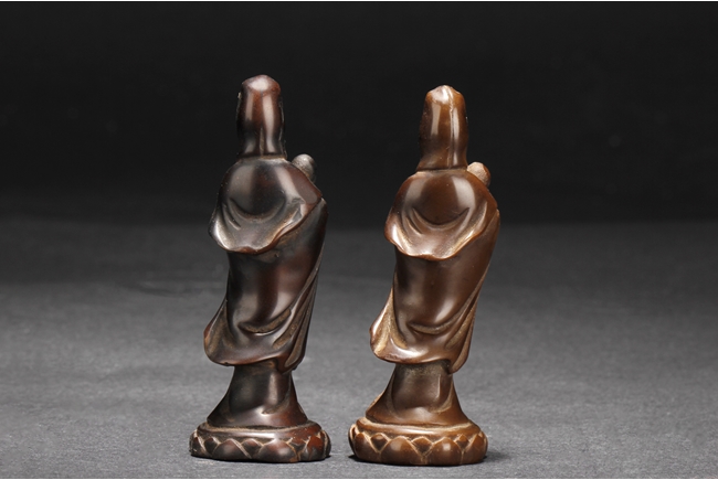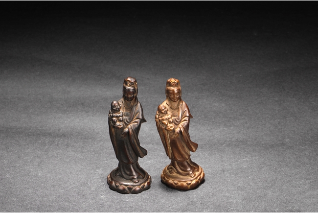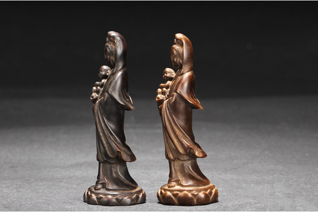 The two Guanyin figures are almost identical in design, both stands on a lotus pad, with one hand holding a baby, symbolizing fertility. One Guanyin with brown color, the other with deeper brown-black color.