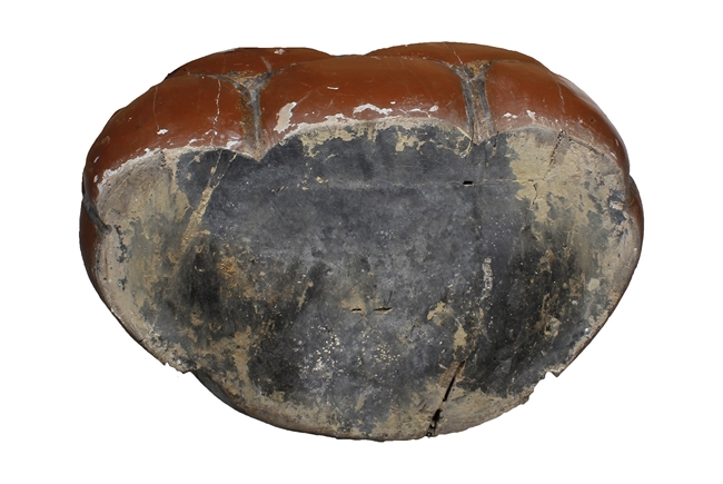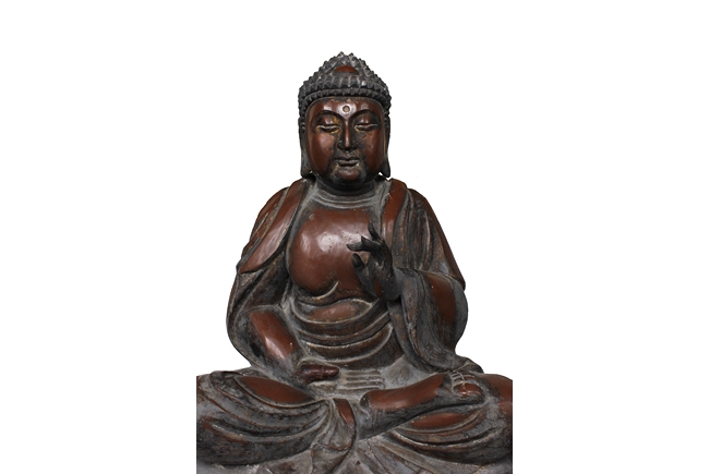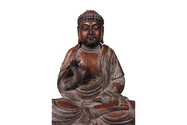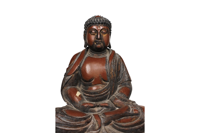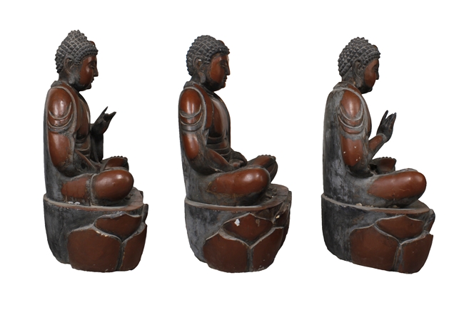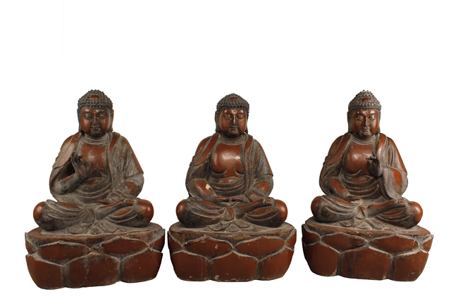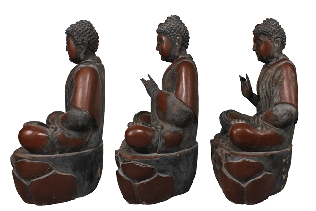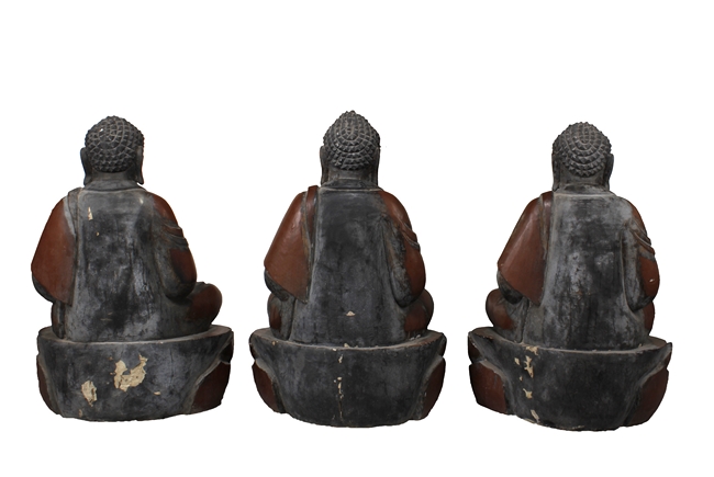 The three clay Trikaya Buddha all seated in dhyanasana on top of lotus pads, hands in different mudra, robe drapes over their shoulder and shows bare chest, all with closed eyes and serene expressions. Age related chip and damages.
