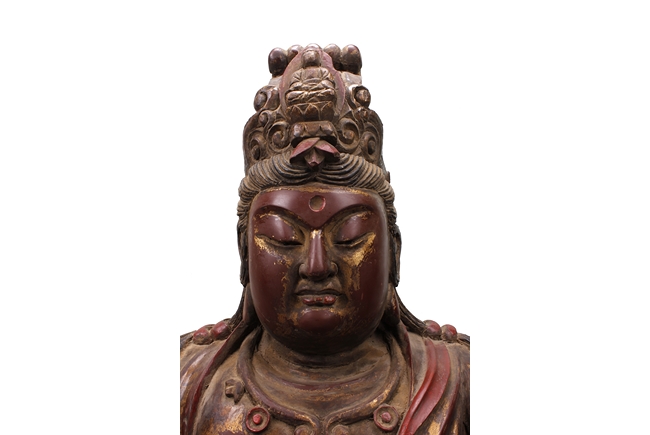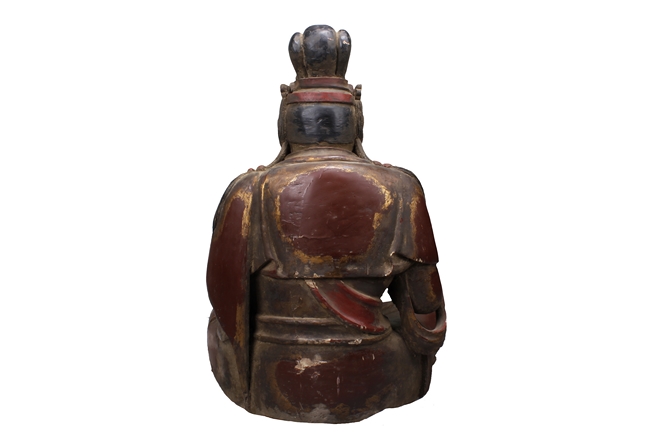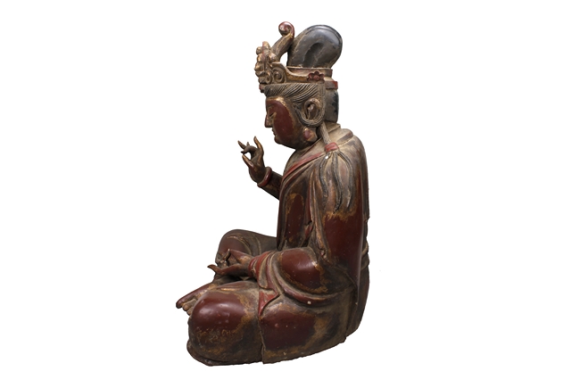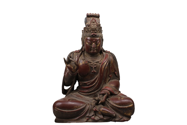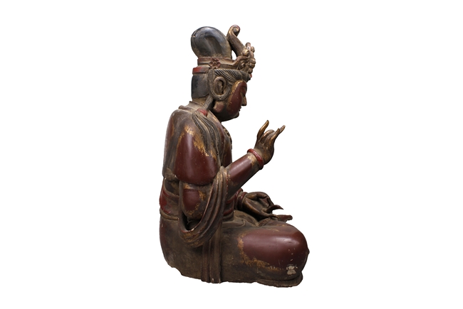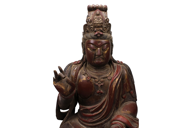 Seated in dhyanasana, the Buddha dressed with robe exposing part of bare chest, wearing necklace, and a crown with Shyakamuni at top, hair straight, and eyes closed. Age related wear and damage.