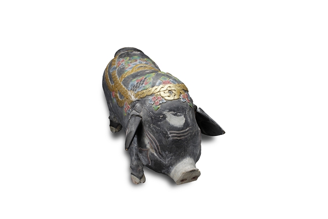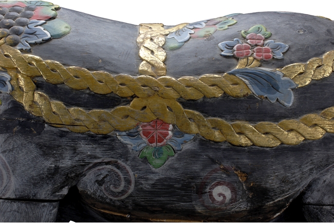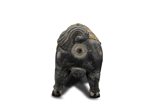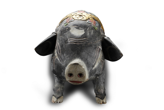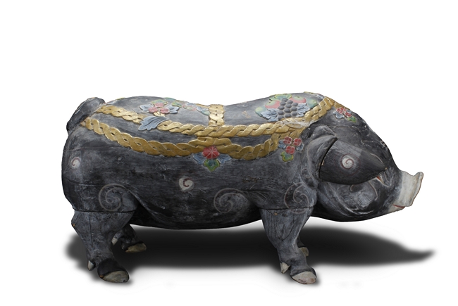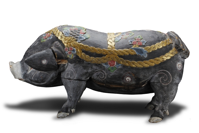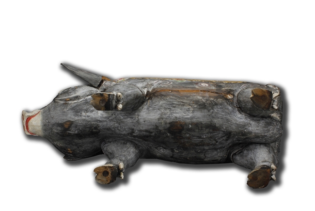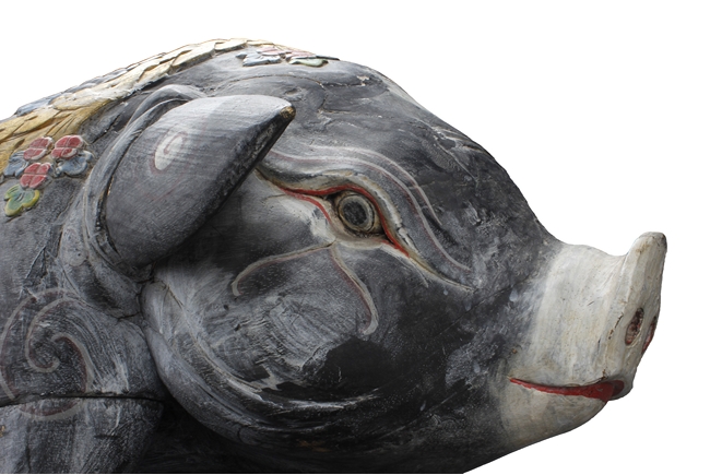 The unusual figure depicts a decorated boar, with ropes, flowers, and fruits on top, painted in black with swirl patterns around the body, each feature carved with detail.