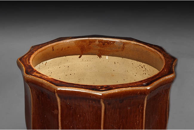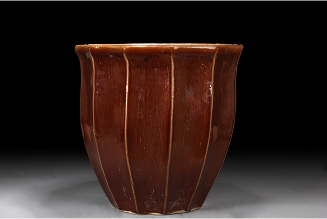 Of tapering floriform, the sides with 12 lobes divided equally, with slightly flaring lip. Bottom unglazed, with two holes. Covered overall in brown glaze.