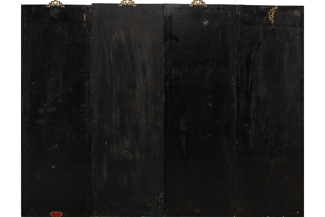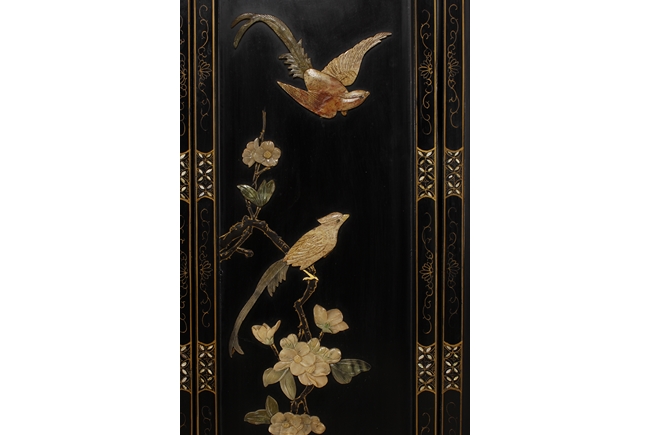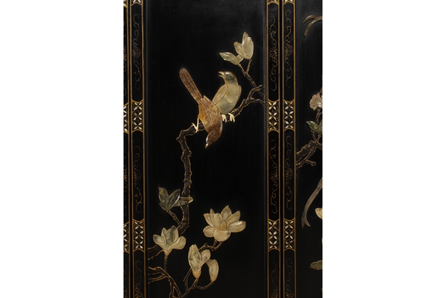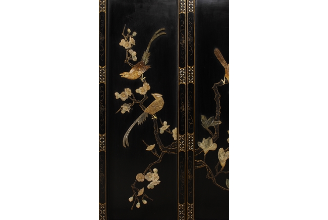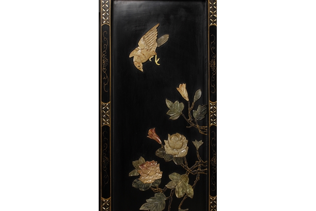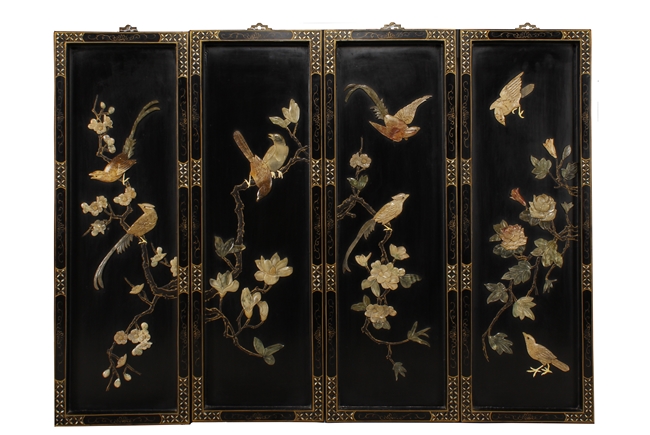 Of rectangular form with decorated borders, the lacquer applique hanging screens depict scenes of perched and flying birds around the blooming flowers on the branches, decorated with multiple semi-precious stones, all over black lacquer.