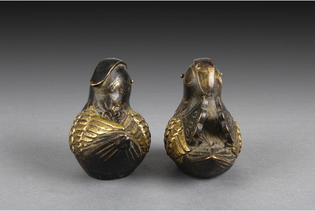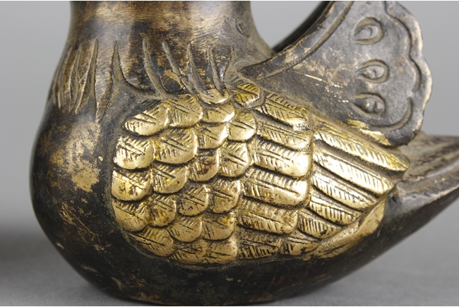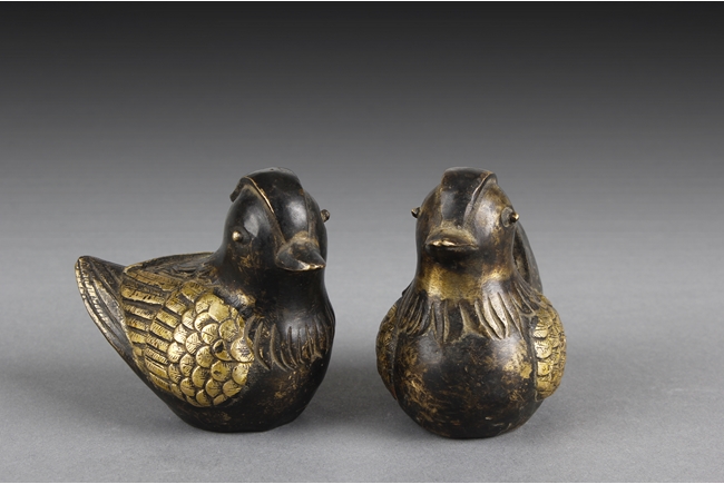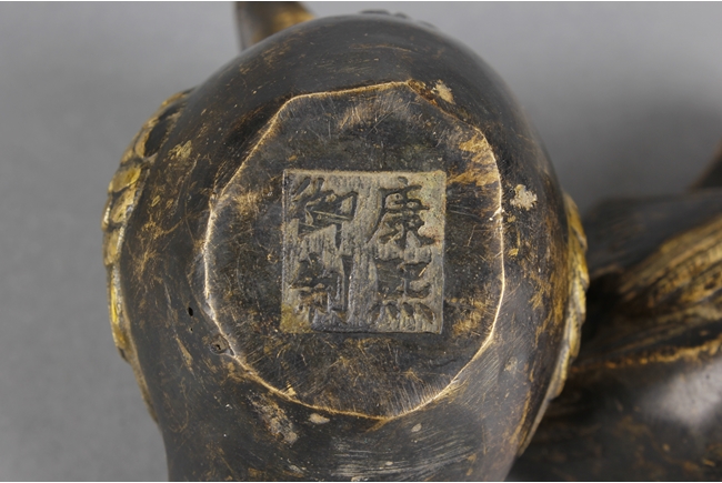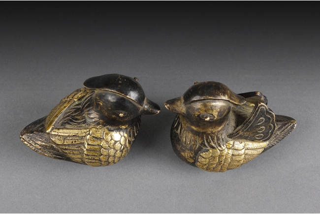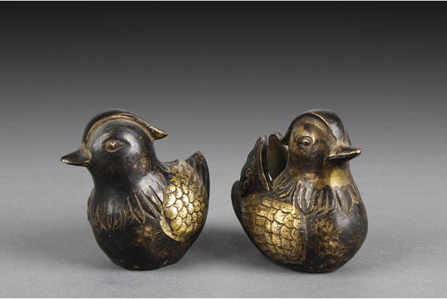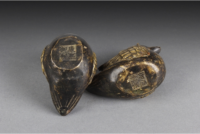 The pair of mandarin ducks depicted as floating on river, with similar features; one duck with wings collapsed, the other with wings spread. Bottom bears four character "KANGXI" mark.