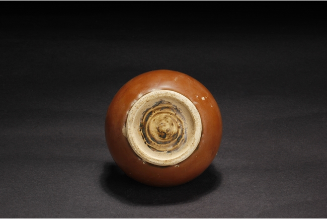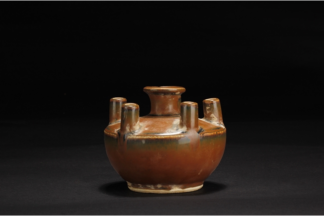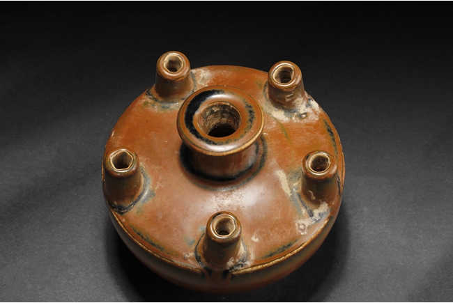 Of reversed dome form, the bottle with five small straight openings on the shoulder, slightly shorter than the main opening, body glazed in orange with hints of black, bottom remain unglazed.