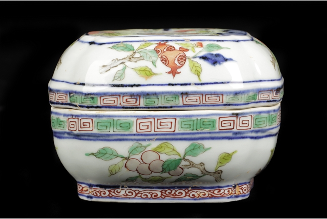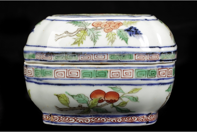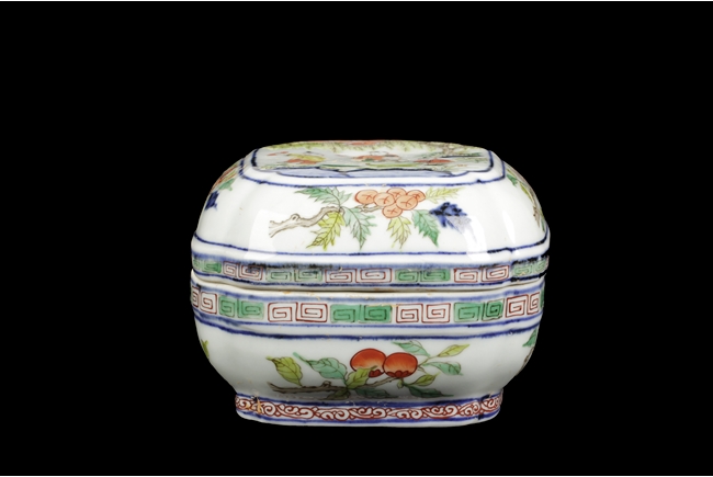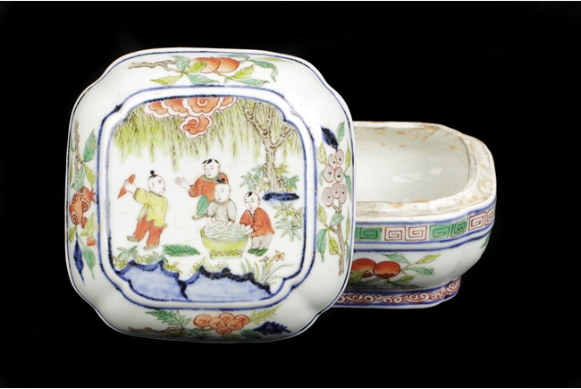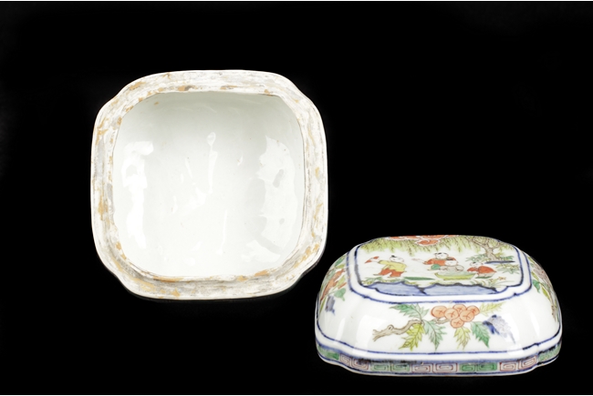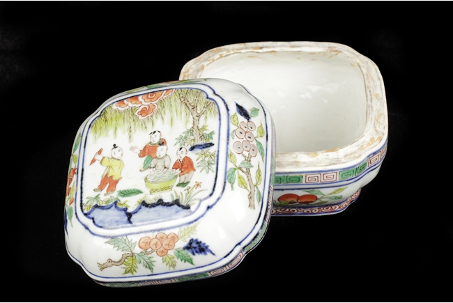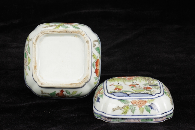 The box of square shape with rounded and caved in corners, the surface depicting four young children doing chores in an outside setting, with trees, plants, and clouds around them, the sides with various fruits, and bottom bears four character mark.