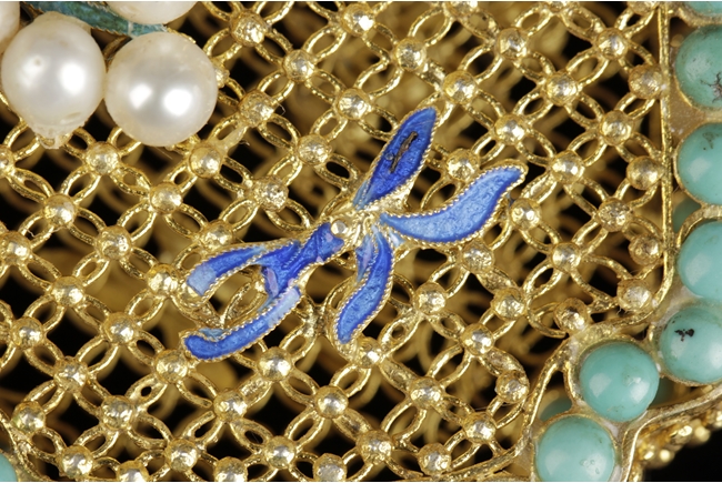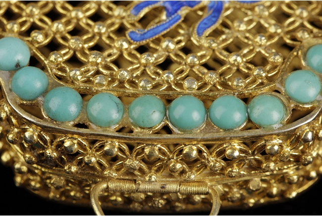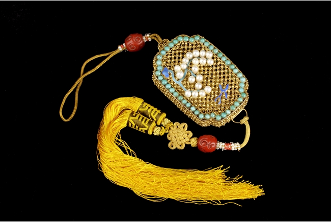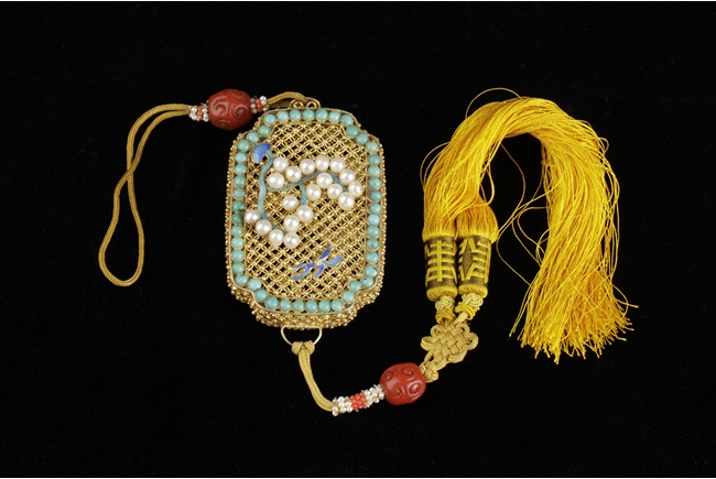 Of rectangular form with rounded and caved in corners, the perfume pouch decorated with turquoise and pearl beads on both sides, the gold lines creates Chinese coin patterns.