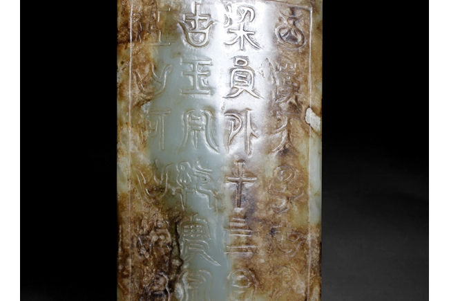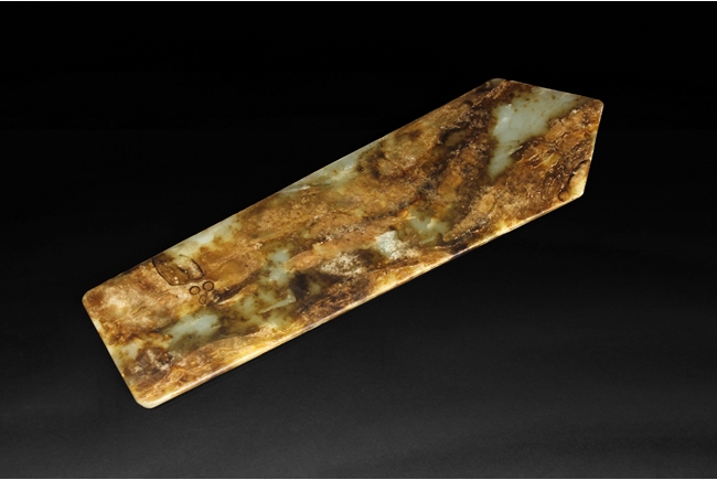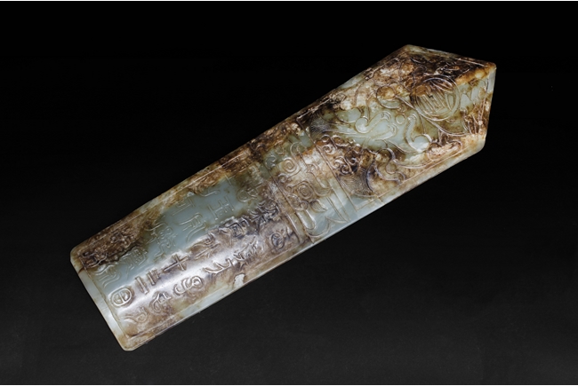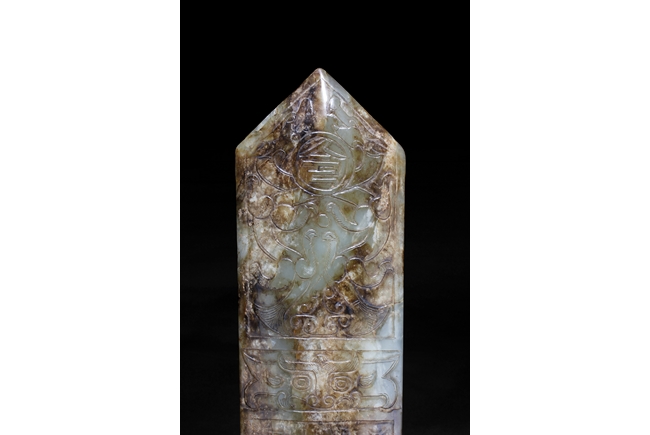 Of rectangular form with one end in triangular form, the stone of celadon color with large areas of russet. The top carved with two dragons confronting each other, middle with Taotie beast mask, and the bottom carved with four lines of Chinese, the reverse with mostly russet.