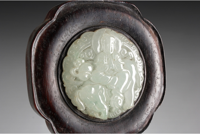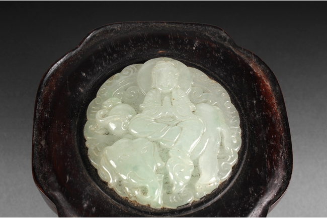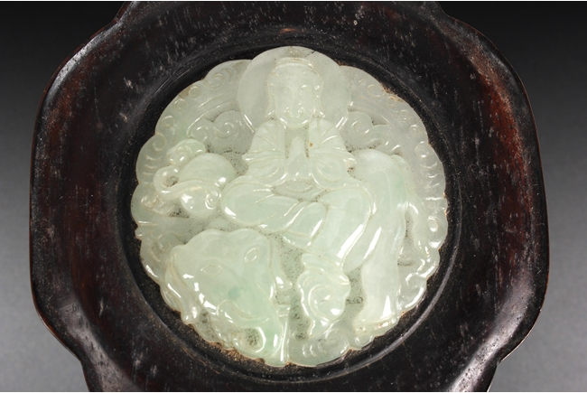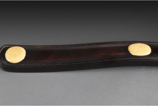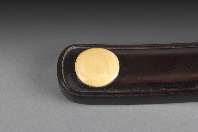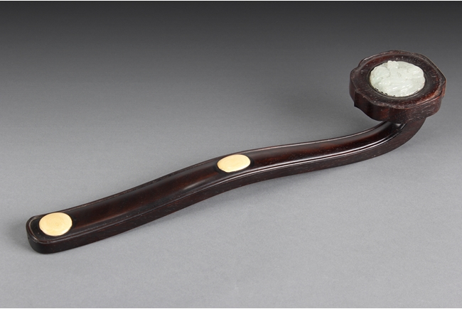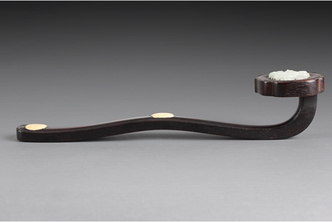 The Ruyi of dark brown/black color, inset with two small ivory pieces at middle and handle, and a carved jade at top, which depicts a Buddha seated on an elephant. 19th century.