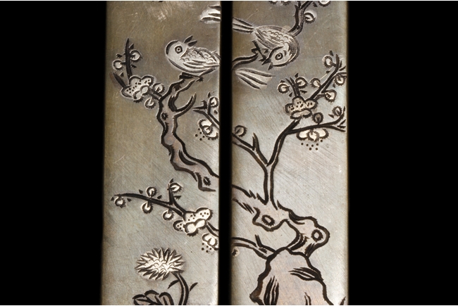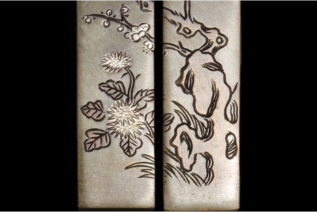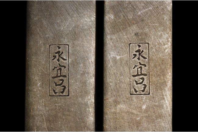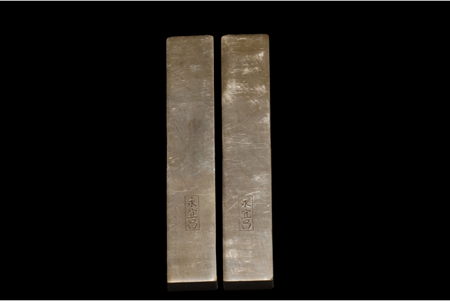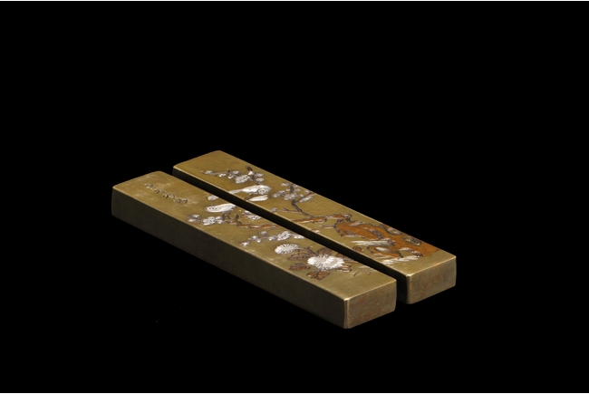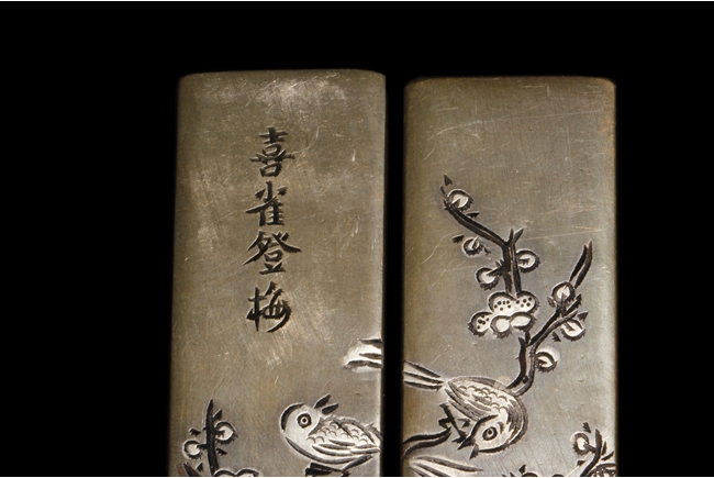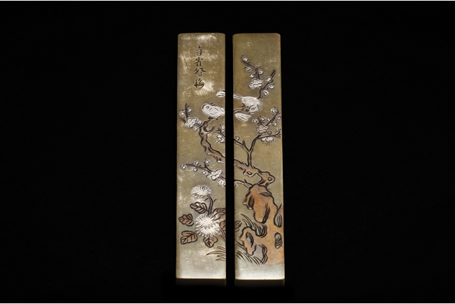 Of rectangular shape, the two paperweights are identical in size, carved on the surface of two magpie birds perched on a blooming plum flowers tree, with four Chinese characters on one paperweight, the reverse with three character Chinese mark "Yong Yichang".