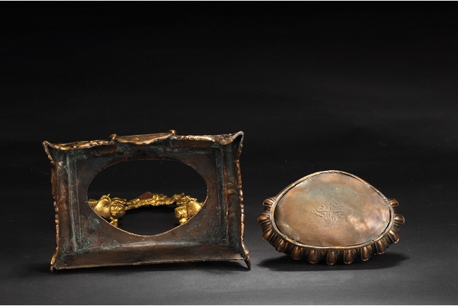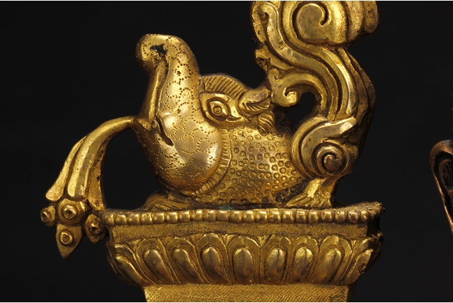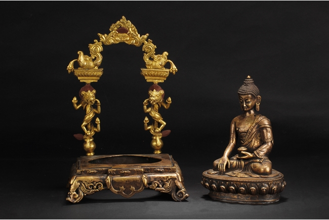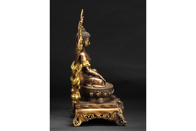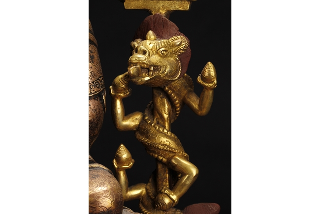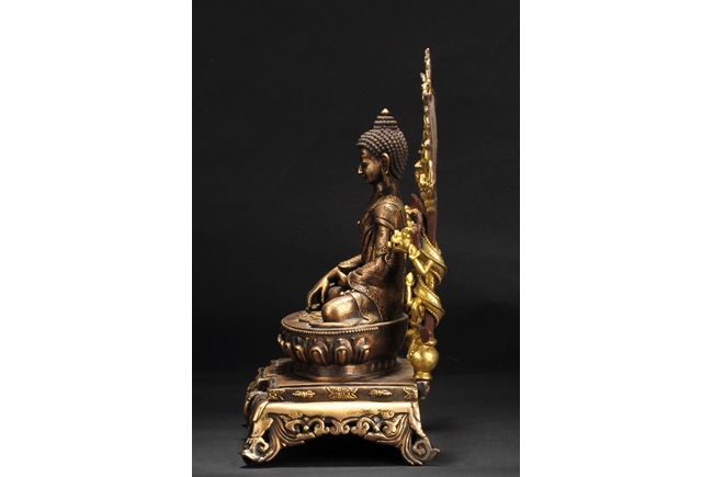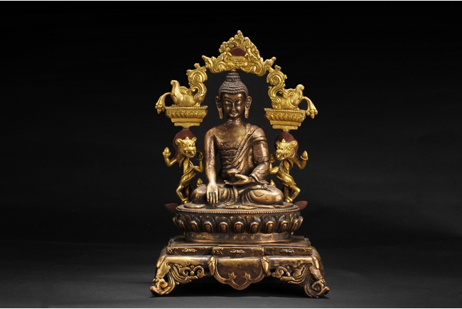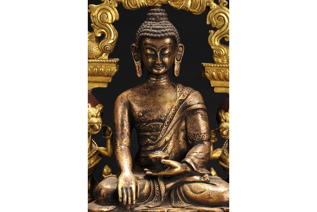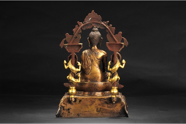 Seated in dhyanasana on top of lotus pad placed on a square plinth, hands in bhumisparsha mudra, dressed in loose robe draped over one shoulder and exposing bare chest, the Buddha surrounded by mythical beasts and monsters.