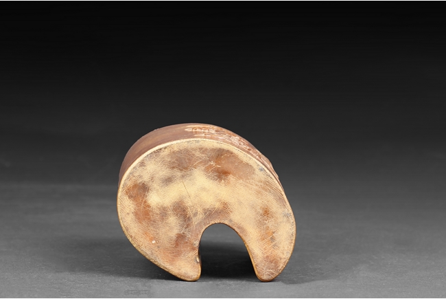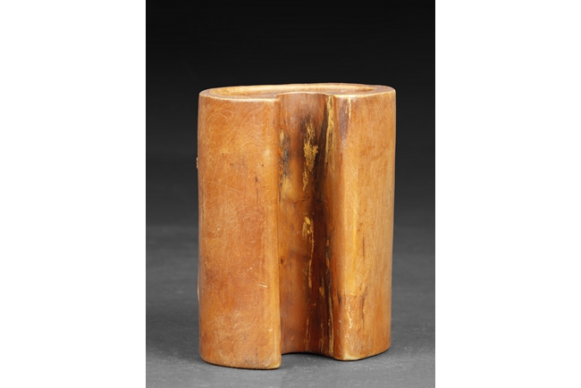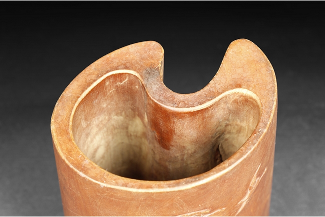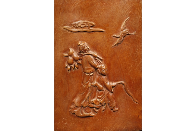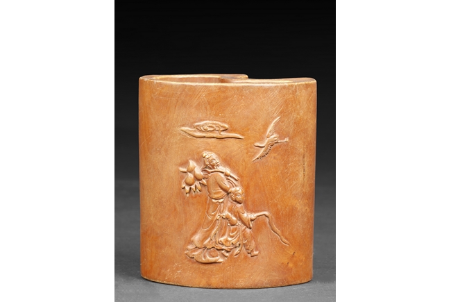 The brushpot of irregular cylindrical shape, with one side caved in naturalistic, the surface carved with an elder and a young boy, walking forward, with cloud and crane in the sky, the wood with natural color and grains. 19th century.
