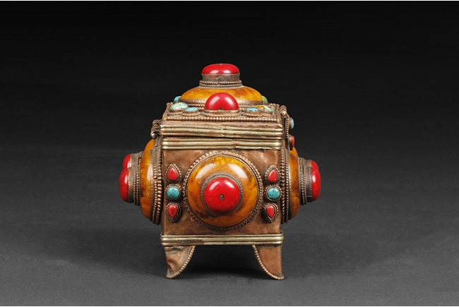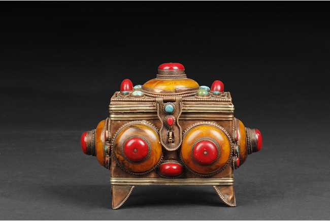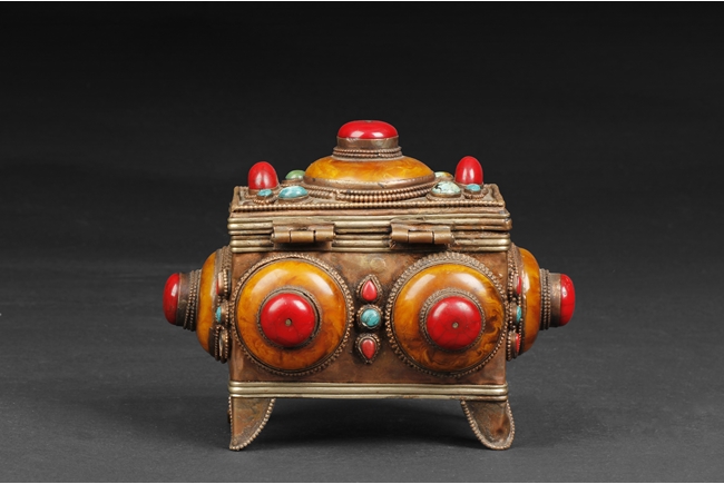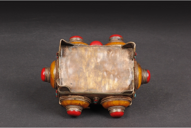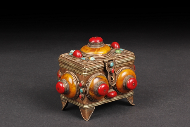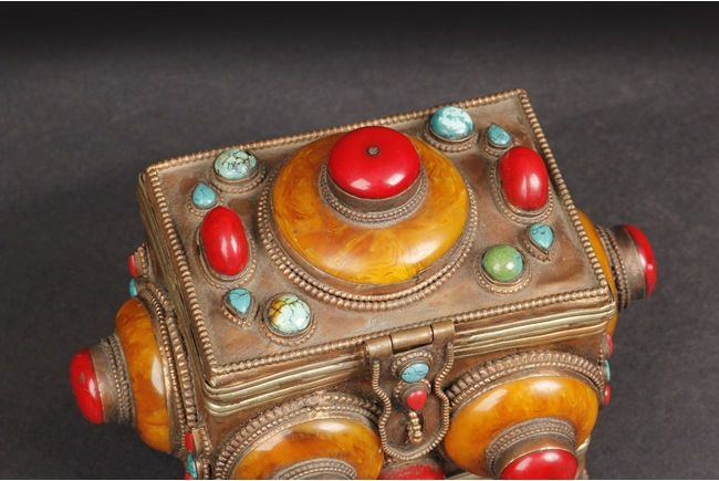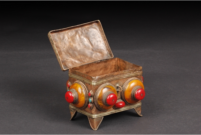 The box of rectangular form, supported by four triangular and feet, decorated with various semi-precious gems. 19th century.