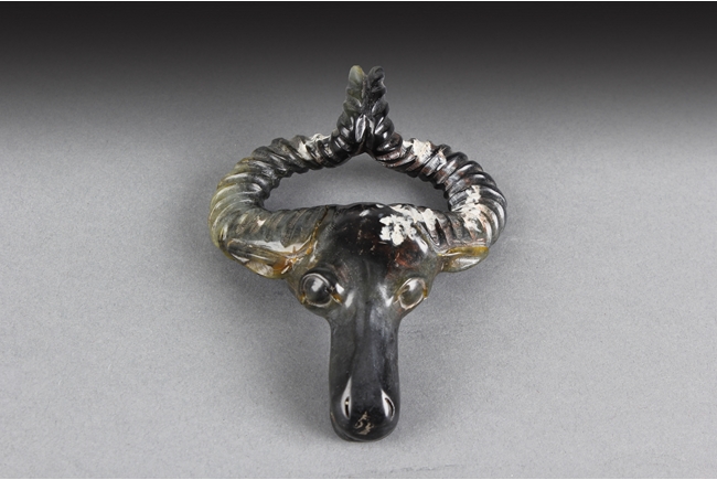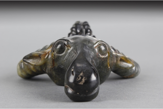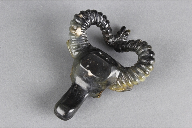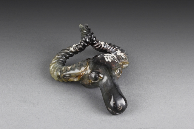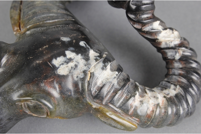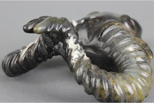 The spinach jade carving depicts the head of a buffalo, with horns bending back and upwards, ears at horn level, and eyes wide open. Russet present around the jade. 19th century.