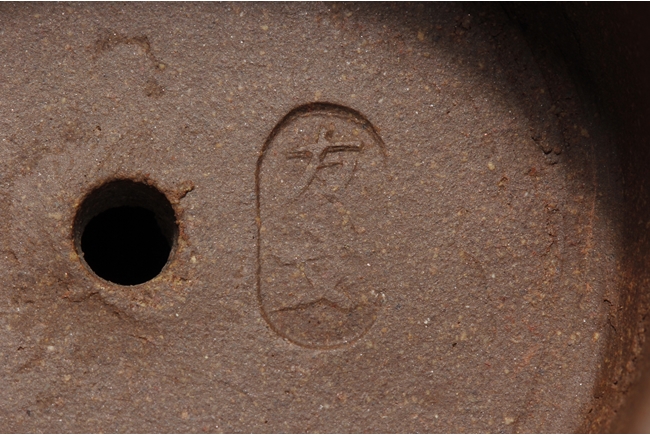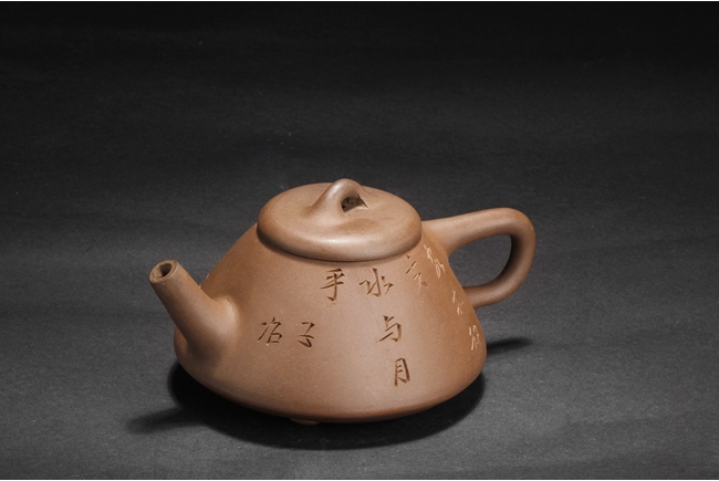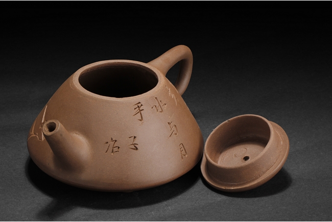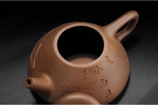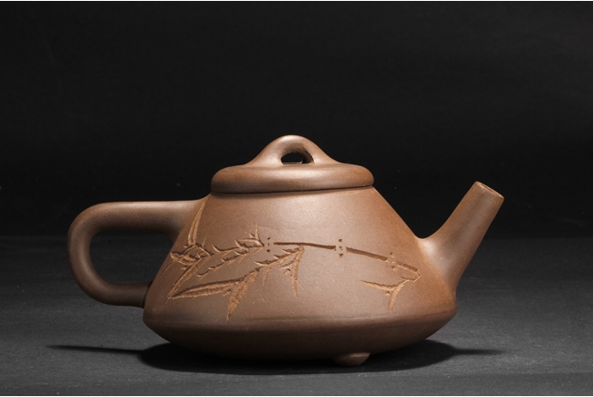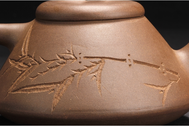 Body of cone shape, one side depicts a bamboo branch, the other with engraved Chinese characters, bottom with four characters "Yang Pengnian" mark, and lid with two characters mark.