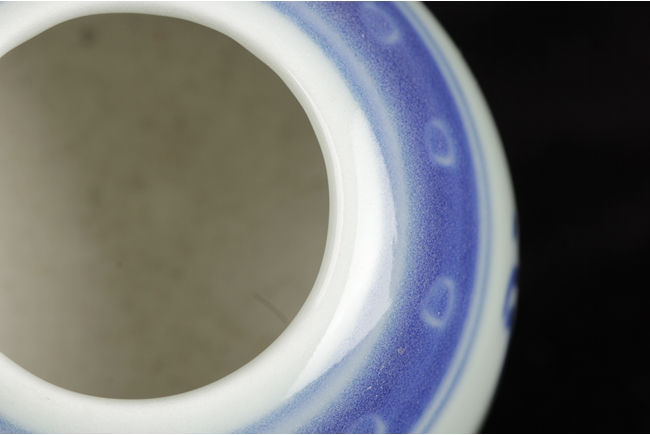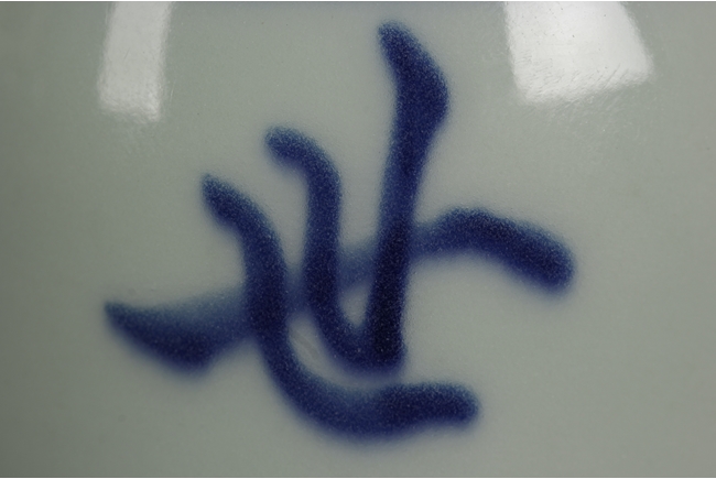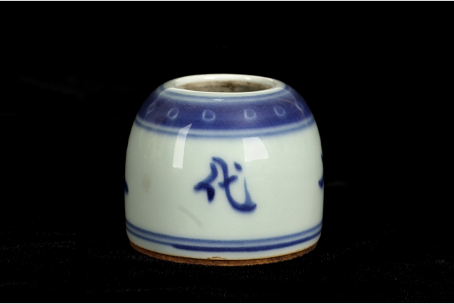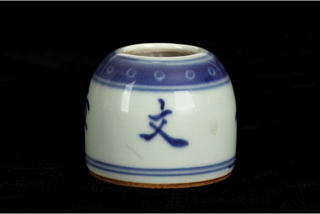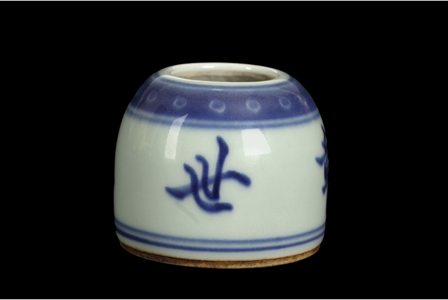 Of dome shape, the blue and white brush washer depicts four Chinese characters on the body, between scrolling double line patterns and scrolling band of round dots, the bottom with double ring pattern. 19th century.