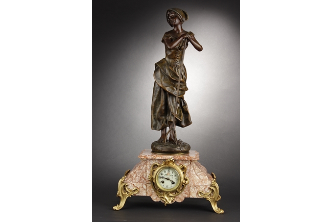 French marble mantle clock surmounted by a female sculpture entitled "Belle Fermiere" after the original by Robert Pfeffer (France, 1885-1954), a peasant woman leaning on a pitch fork, the sculpture on a stepped marble base, clock with floral painted porcelain face, marked with a store name in Lille France and behind a beveled glass door, time and strike works by F. (Fritz) Marti, Paris