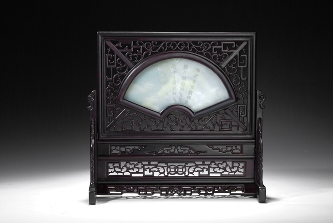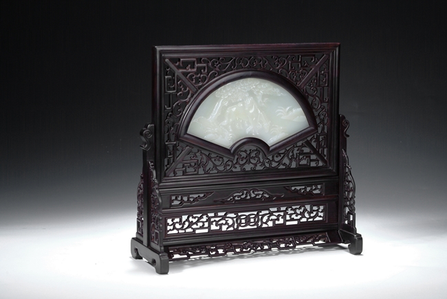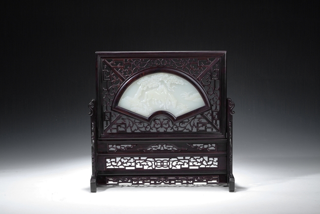 The jade plaque is of fan shape, enclosed by pierce carved hardwood frames. The jade plaque depicts two horses near a river, with poem on the back side. The frame consists of many patterns of flowers, fortune, and longevity.