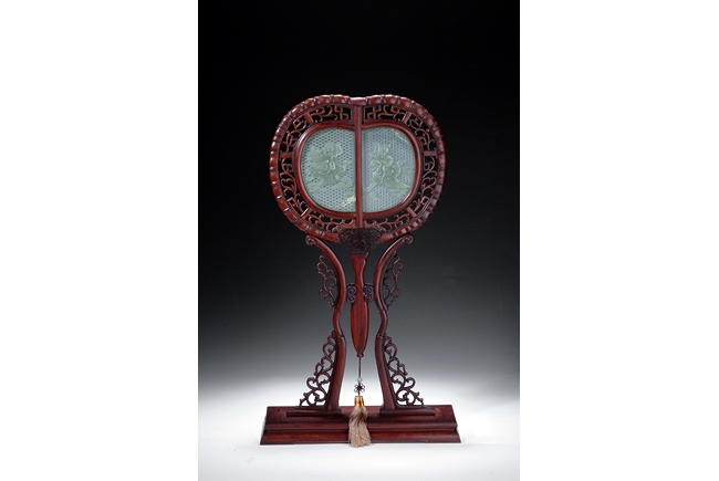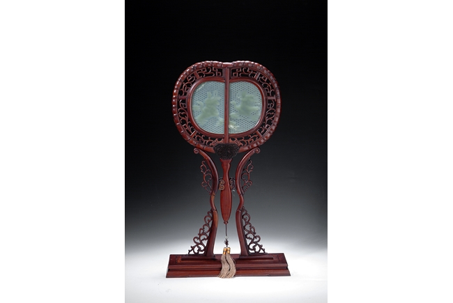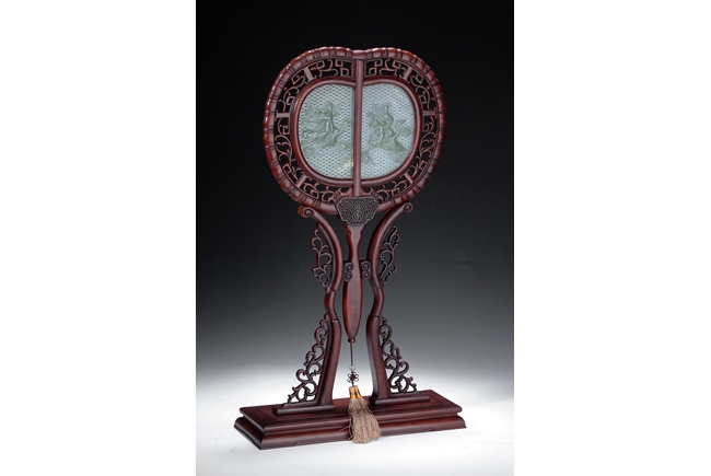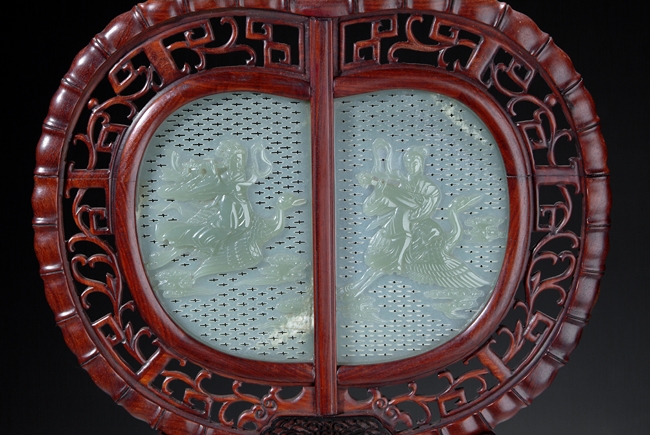 The table screen consists of two parts; a jade plaque on a fan and a stand to hold the fan, forming the table screen. The jade depicts two fairies riding on a phoenix. The fan frame itself is pierce carved as well, showing delicate patterns.