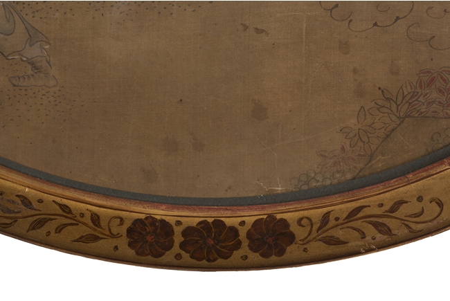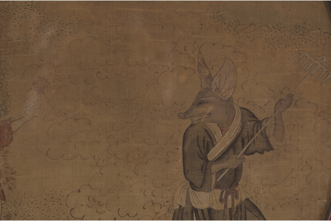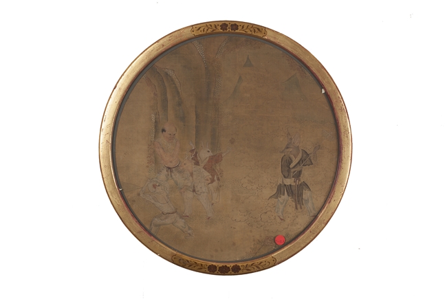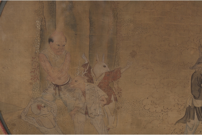 This silk painting is framed in a circular frame and depicts four beast-like creatures interacting with each other.