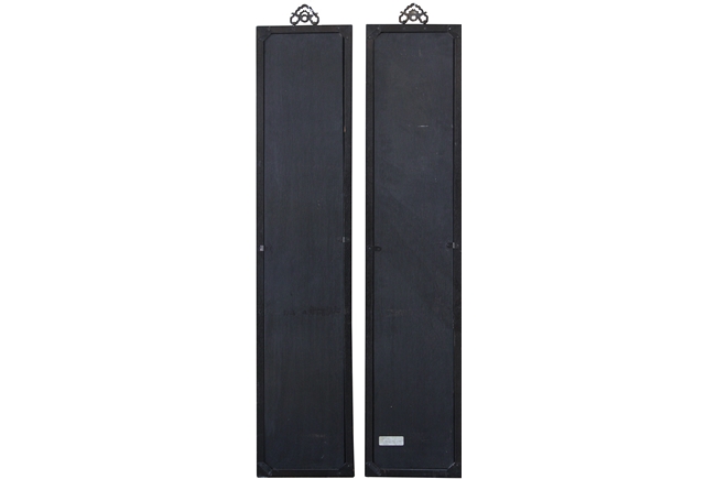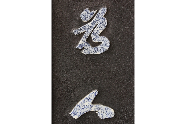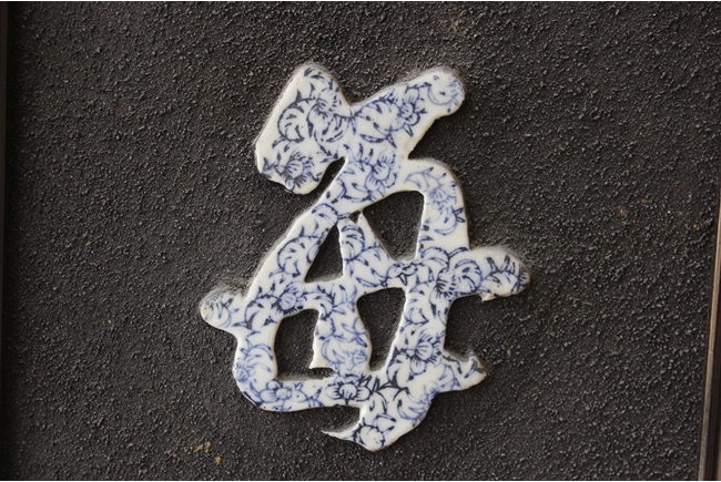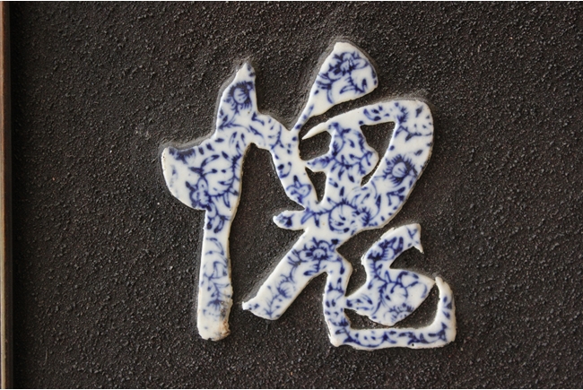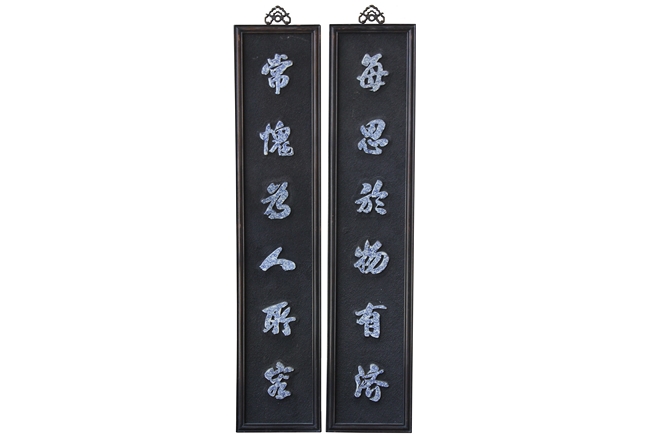 The plaques each contain six Chinese characters made from blue and white porcelain, combined to a couplet.