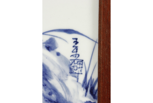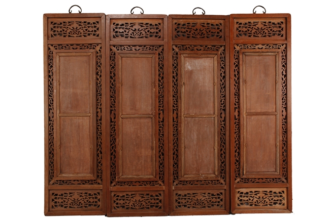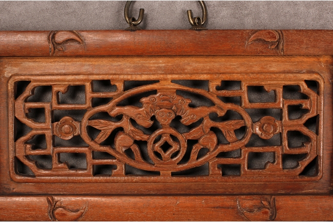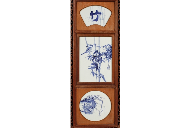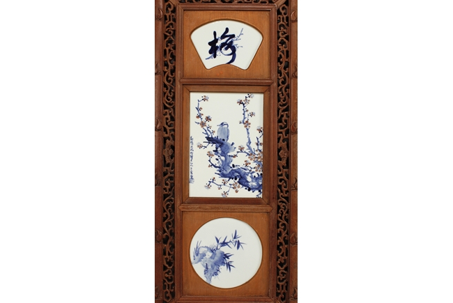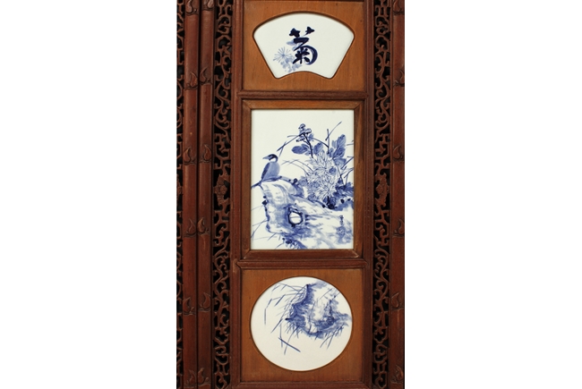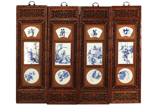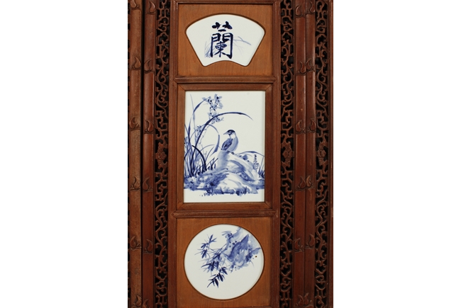Of rectangular form, the hanging screens pierce carved on the top and side with interlocking vine patterns, middle inset with three blue and white porcelain plaques, one fan shaped with Chinese character, one rectangular shaped with birds and flowers corresponding to the character, and one round shaped with bamboo leaves.