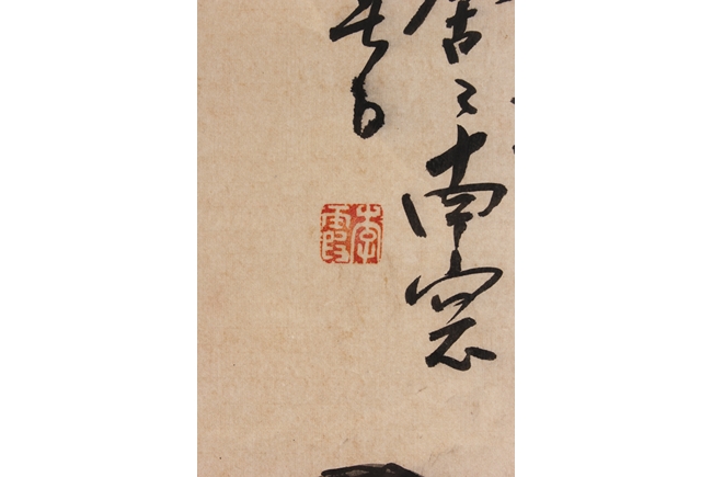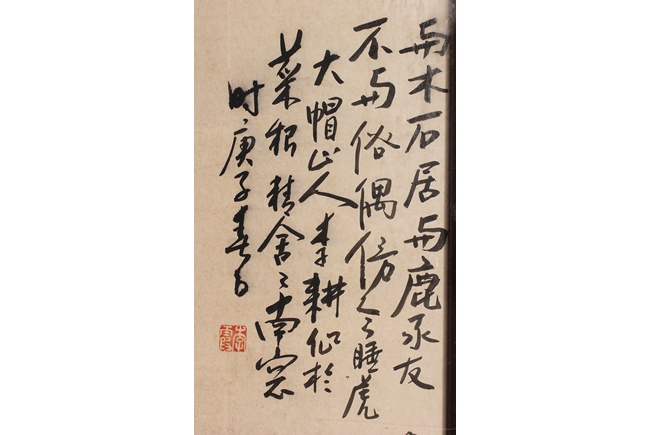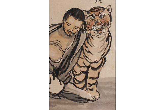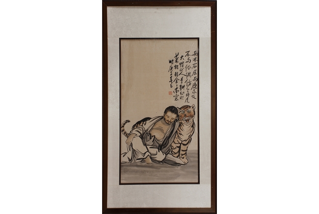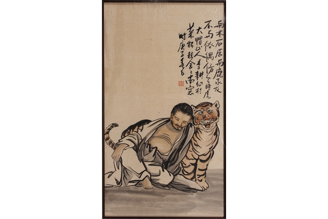 The framed painting depicts a well groomed man, dressed in robe open at chest, casually seated on the ground next to a small roaring tiger, with Chinese poem calligraphy, artist signature, and seal mark on top right corner.