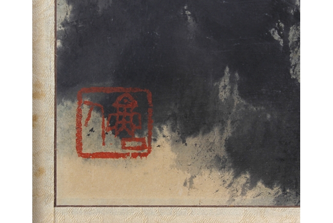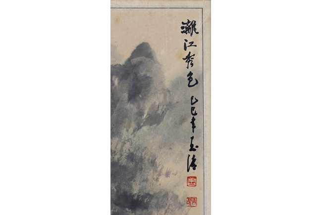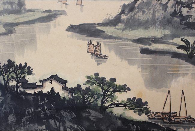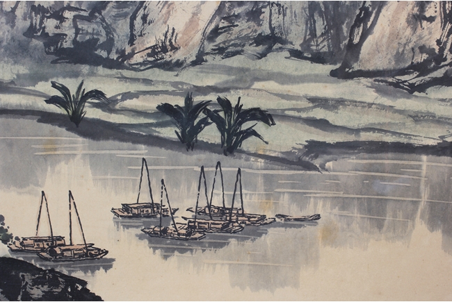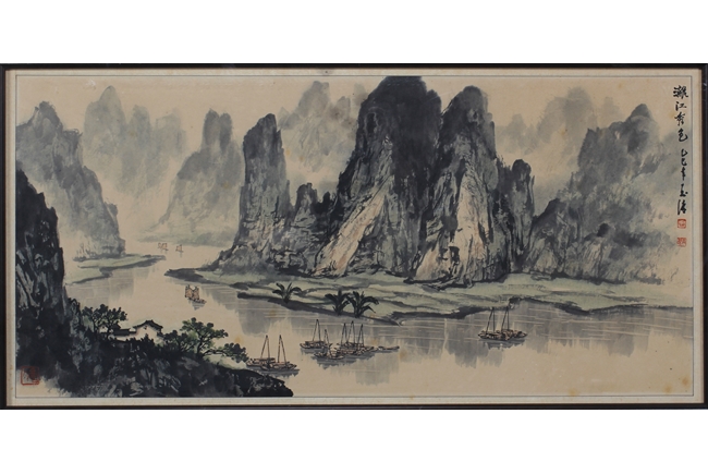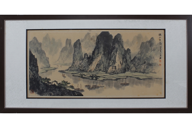 The framed painting depicts the beautiful scenery of Li River, located in Guangxi of China, showing the peaceful river, tall mountains, green surroundings, and resting fishing boats. Artist signature and mark on the right side, additional mark on bottom left.