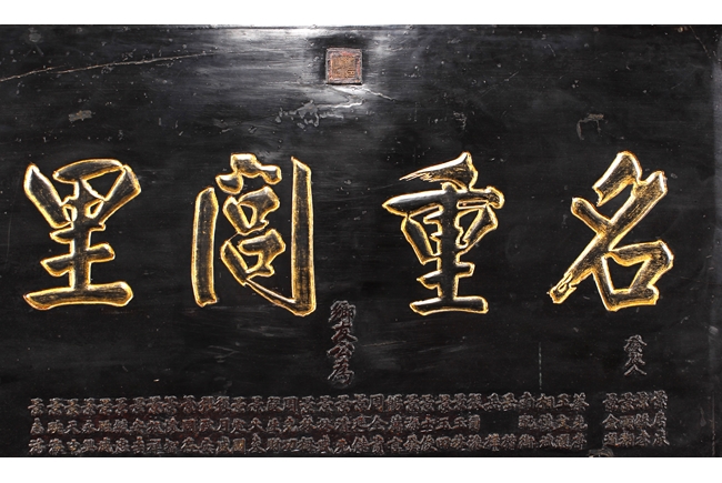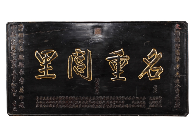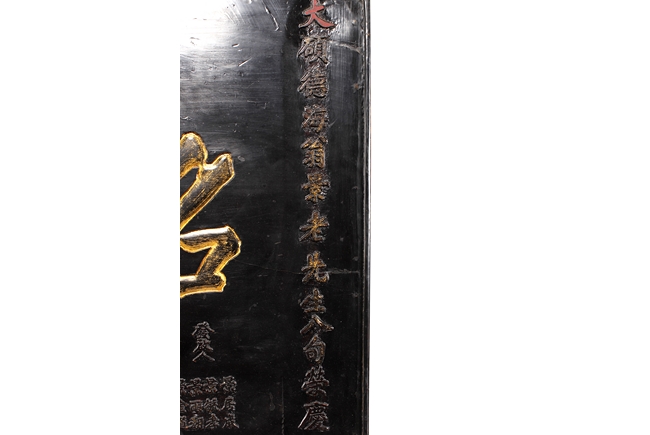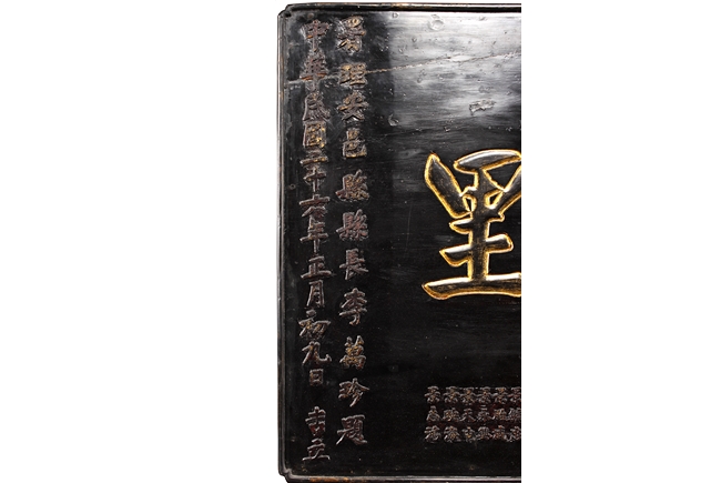 The large lacquer wood hanging plaque was inscribed with many Chinese characters, including four large characters in the center, a list of names on the bottom, the author and date lines on the left, and the event on the right. Written by "Li Wanzhen".