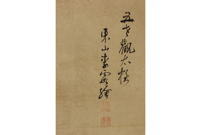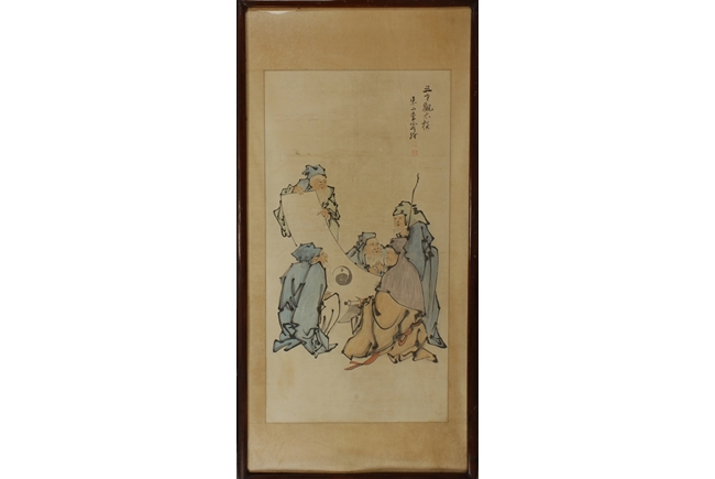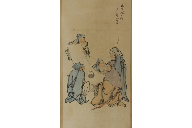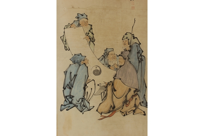 The framed painting depicts the Chinese story of five famous elders gathered together, observing the Taichi symbol, deriving its meaning and applying it to the world around them. Artist signature and mark on top right.